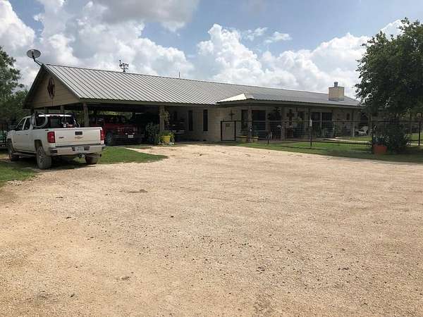 510+ acres fenced and cross fenced into 4 pastures and 1 trap. 10 water lots. 60 x 40 barn with cement floor and 25' shed , row on 2 sides. A set of pipe panel working pens. Beautiful white rock 4 bedroom 3 1/2 bath home that is 2880 sq ft. with 10 foot wrap around porches. Tile floors thru out, wood burning fireplace in great room. Open living room, dining and kitchen with incredible bar. All 4 bedrooms are extremely large with nice walk in closets. There is also a 3/1 bunkhouse. This property also features a dirt tank stocked with catfish. There is live water on this acreage. The start of San Felipe creek. Water table is about 8 ft. Great soil. 2 fields that can be planted when rainfall is sufficient. There are whitetail deer, axis, turkey ,dove and quail. 2 water wells. Turn key operation.