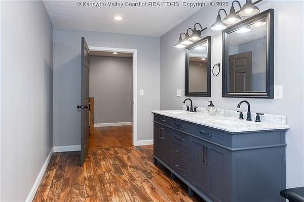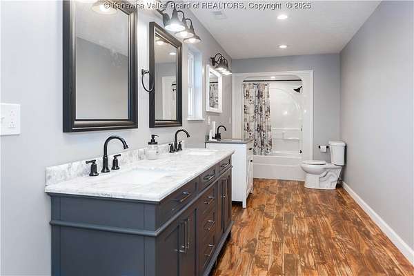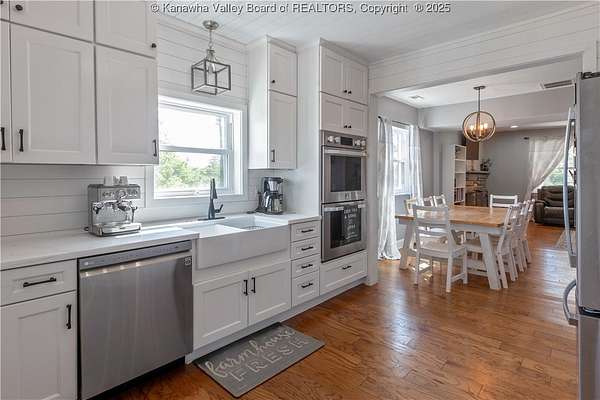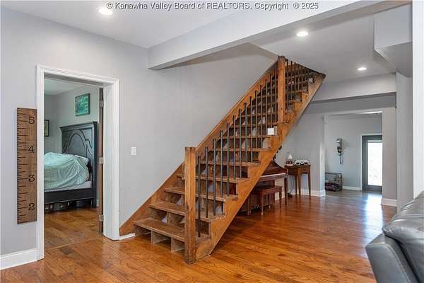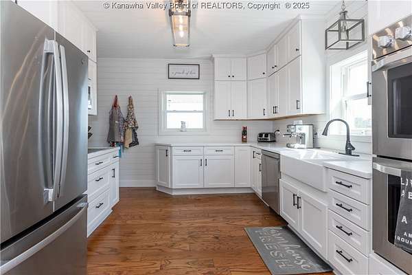 Beautifully updated 4 bedroom/4 bath home on 7.56 acres located approx 20 minutes from I-64. Hardwoods in primary living areas with waterproof vinyl in wet areas; huge family room attaches to lovely ship lap kitchen with solid surface countertops and to the ceiling cabinetry; living-dining-kitchen provides great room appeal; primary ensuite on main floor features large bath and generous walk-in closets; the upper level boasts of 3 sizable bedrooms with walk-in closets; large full bath, and huge laundry room. Outside there are 2 covered porches and a detached 2-car garage, 5-bay shed, and small barn. Easy circle around driveway to the rear of the home makes parking equipment, camper, trailers, and guests vehicles an easy task.
