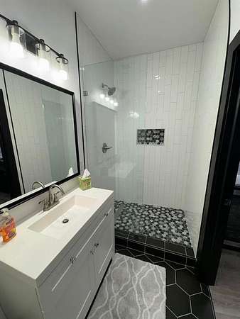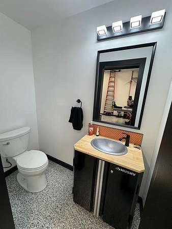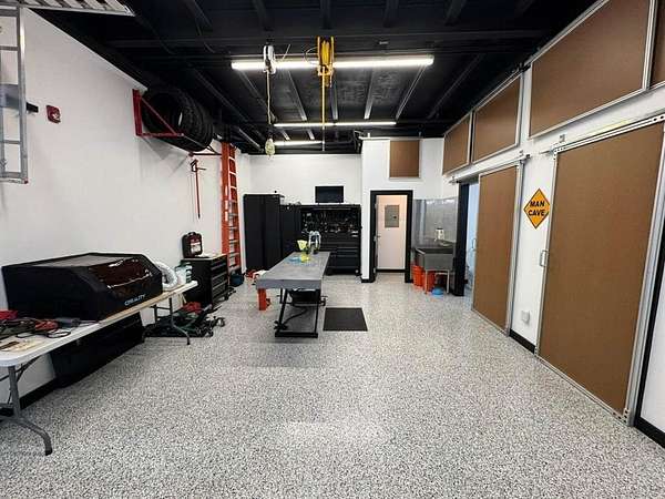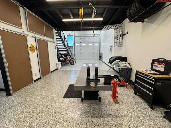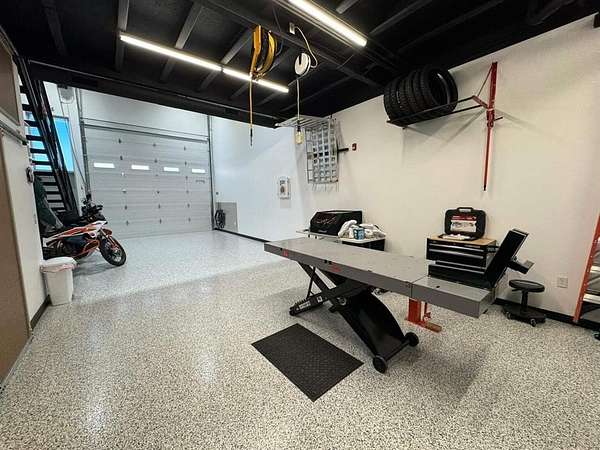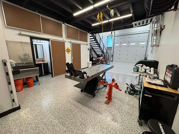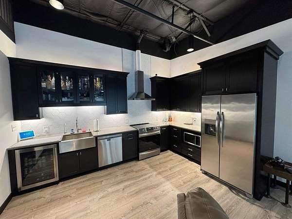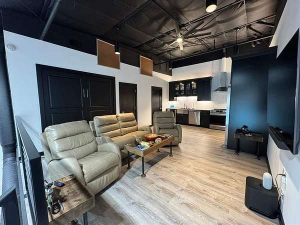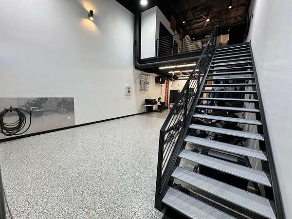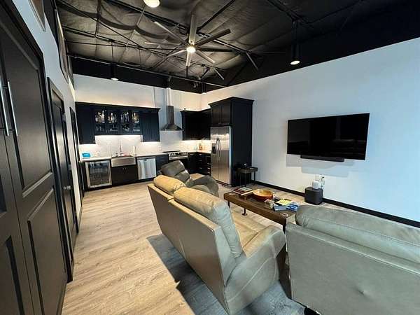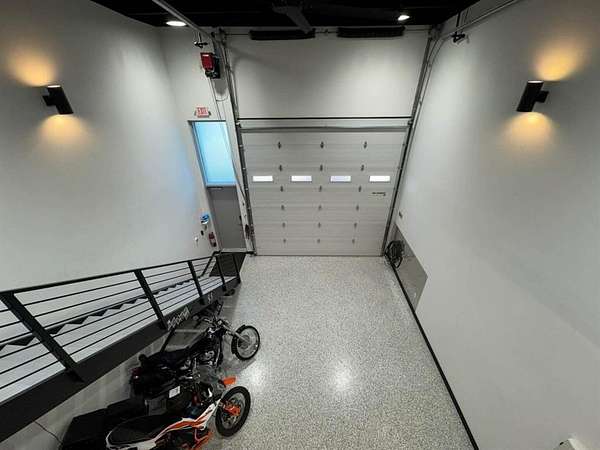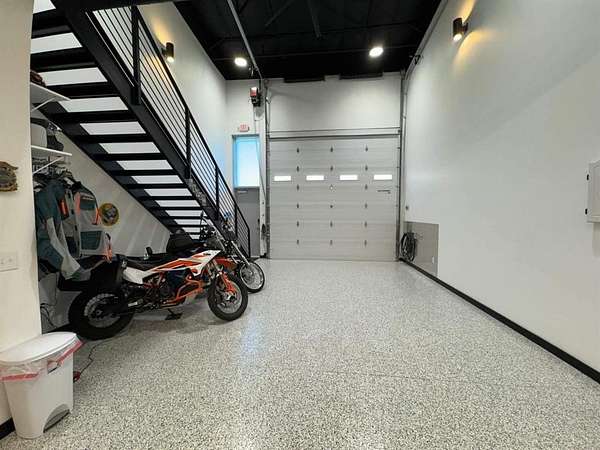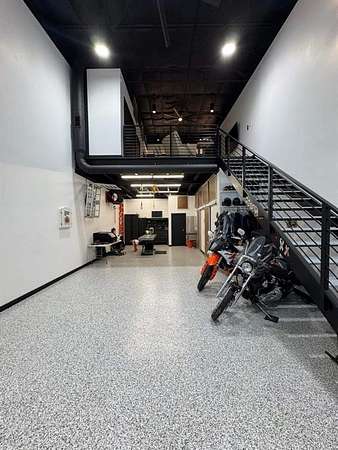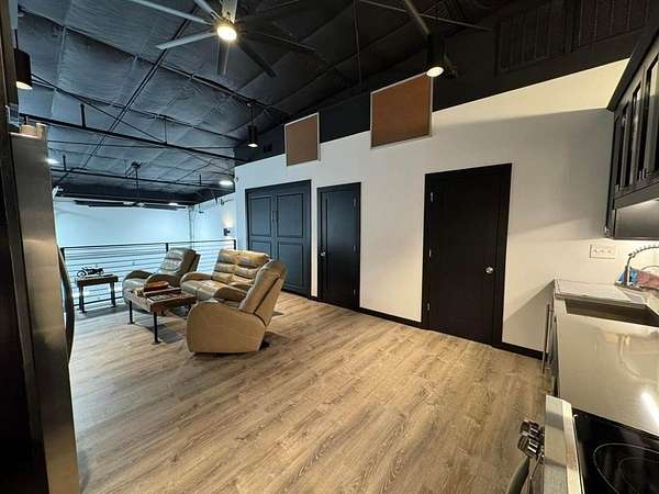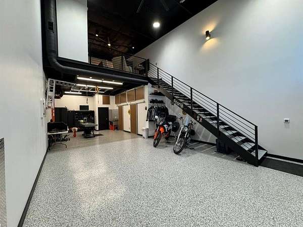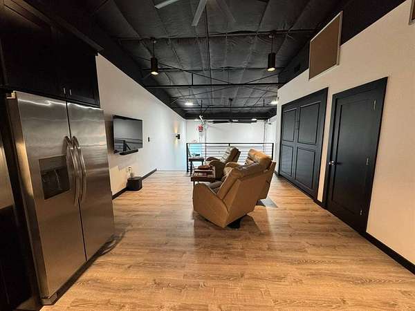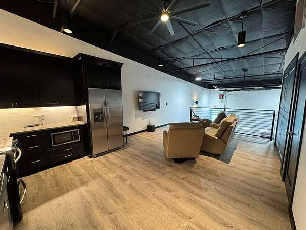 This unit is tastefully finished out downstairs with rustic interior barn doors, epoxy coated flooring, black powder coated metal railings and staircase, a half bathroom and laundry room. Upstairs find engineered hardwood flooring and black craftsman style doors in this mezzanine great room. The kitchen is fully equipped with a stainless farmer's sink, microwave, refrigerator, garbage disposal, range and temperature controlled beverage fridge. There is an incredible amount of storage in this unit and a few cool surprises I can show you.