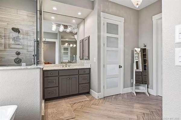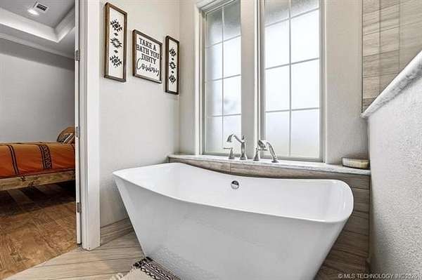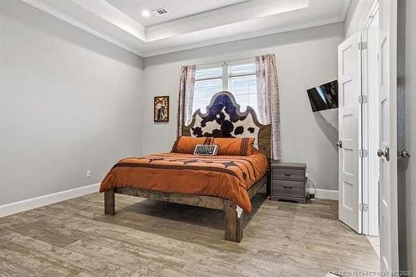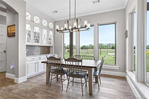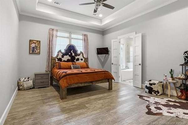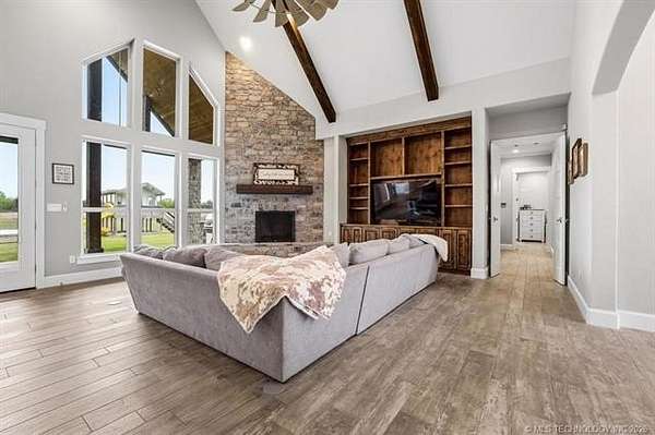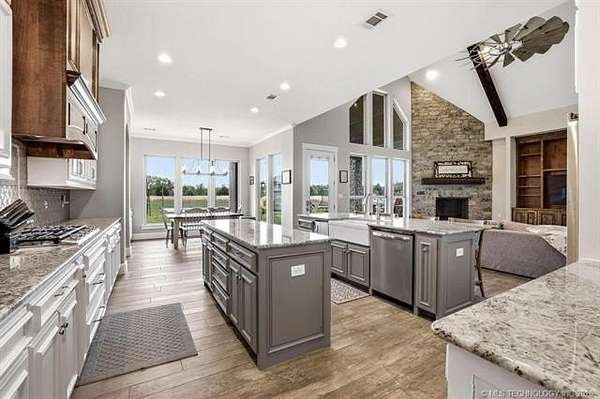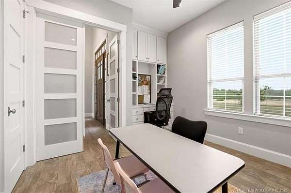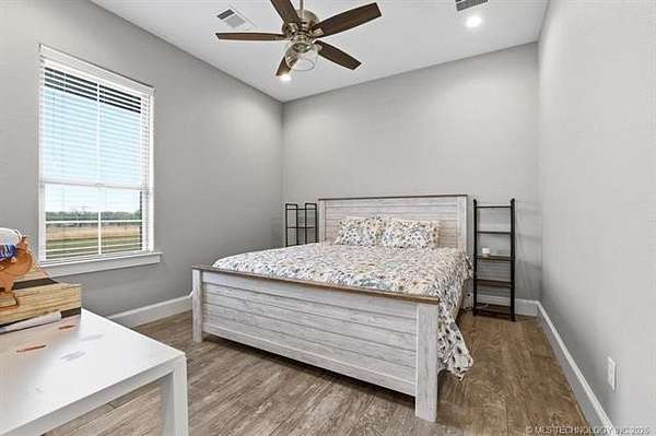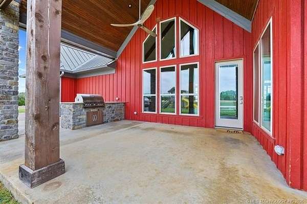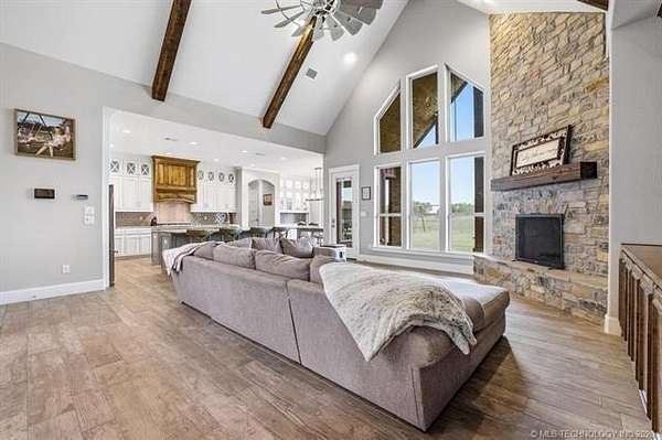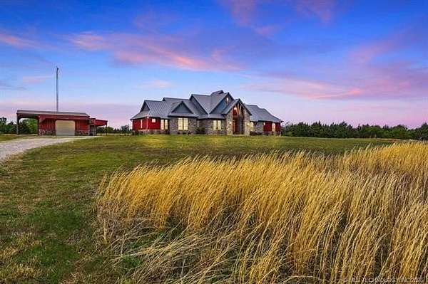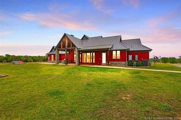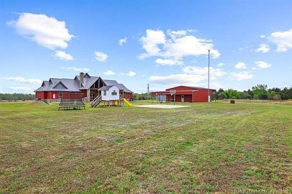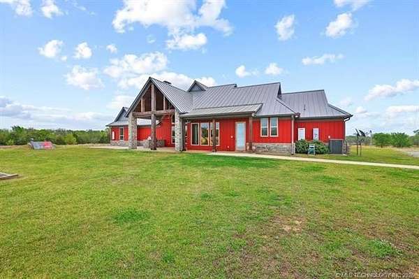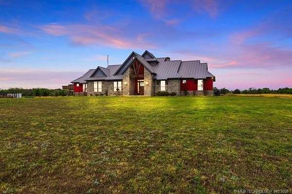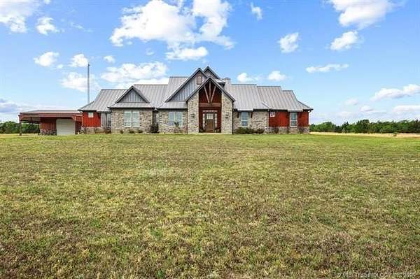 Experience the perfect blend of refined living and wide-open space with this stunning custom-built ranch estate situated on approximately 122.65 acres in Bryan County. The heart of the home showcases a grand living area with vaulted ceilings, exposed beams, and a floor-to-ceiling stone fireplace, seamlessly flowing into a chef's kitchen complete with an oversized island, custom cabinetry, and an inviting dining space. A private primary suite offers a true retreat with a spa-inspired bath, soaking tub, walk-in shower, and a spacious closet designed for maximum functionality. Additional bedrooms and a secondary living/family room provide flexibility for guests, hobbies, or multi-generational living, while a dedicated office near the entry creates the perfect work-from-home setup. Step outside and take in the full potential of this property-over 120 acres of gently rolling land with ponds, offering endless opportunities for ranching, recreation, or future development. Property improvements include: - 30x40 shop - 42x60 barn - Covered porch & patio - Attached garage + additional covered parking Utilities include rural water, propane, septic system, and OG&E electric. Located in the desirable Calera market area with convenient access to Durant, Lake Texoma, and the Texas border, this property offers the rare combination of privacy, accessibility, and long-term value.