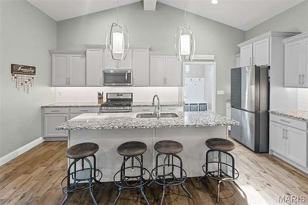 WOW! Incredible opportunity for a qualified VA buyer to ASSUME VA LOAN AT JUST 1.99% INTEREST! Ideally located on 1.52 acres in the Edwardsville School District, this 4-bedroom/3-bath ranch (with finished lower level), offers over 3,300 sq ft of living space on a hidden cul-de-sac within a small, quiet subdivision. A newly added concrete RV pad (36x12) with 50-amp plug provides convenient on-site RV/camper parking--no need for off-site storage. The open floor plan flows seamlessly, showcasing hand-scraped wood flooring, soaring vaulted ceilings, custom millwork, and a dramatic stone fireplace anchoring the great room. Perfect for gatherings, the chef's kitchen features soft-close custom cabinetry, granite counters, stainless steel appliances, and a massive 38x99 island with seating and storage that opens directly to the dining and living areas. A divided bedroom layout ensures privacy, with the primary en-suite showcasing a tray ceiling, dual vanity, luxury tiled walk-in shower, and a large 11x8 closet with custom organization. Main-floor laundry/mud room doubles as a drop zone. The lookout lower level is ideal for game days or movie nights with a huge family/rec room, 4th bedroom (w/dual closets), full bath, bonus room (gym/play/office) and 20x10 storage area. The oversized 3-car garage provides exceptional space for trucks, equipment, and toys. Updates include sump pump (2023), on-demand tankless water heater (2024), and whole-house filtration/softener system (2024)--full list in disclosures/photos. Outdoor living shines with a screened-in deck (2025) complete with stairs and a fun slide leading to an expanded patio, garden area, fenced yard, and a 14x24 Amish shed with loft. Peaceful views of deer, turkeys, and wildlife enhance this private retreat--close to bike trails, parks, and just under 30 minutes to Scott AFB.