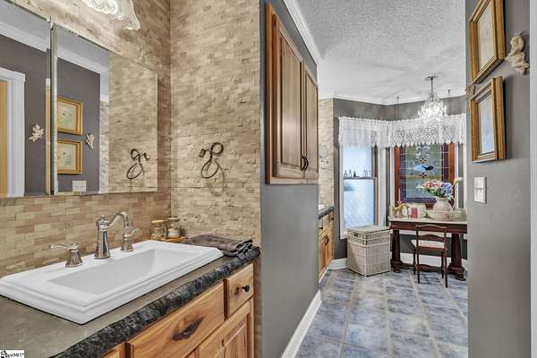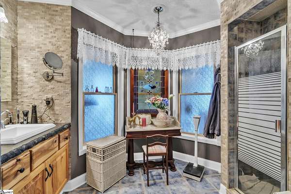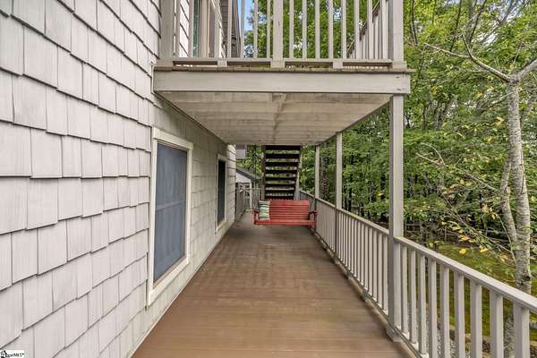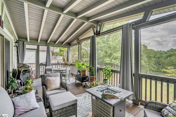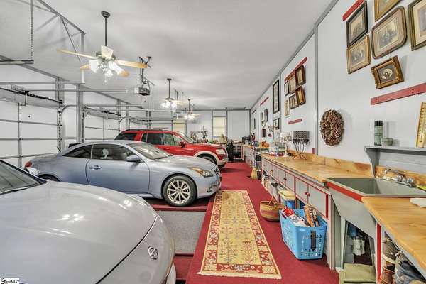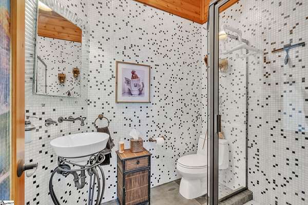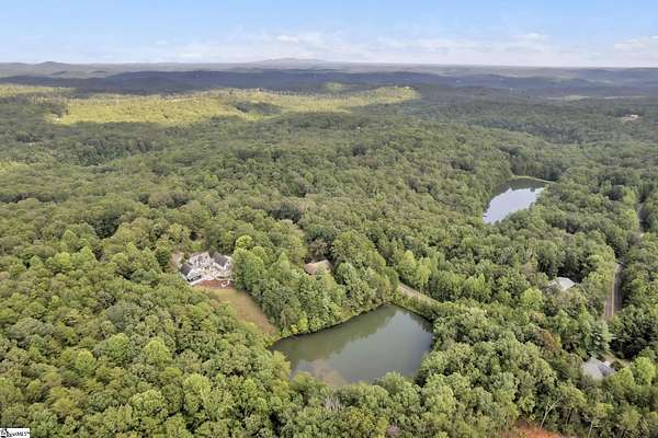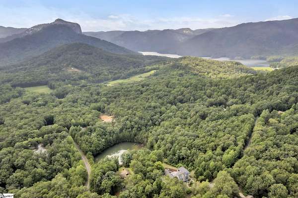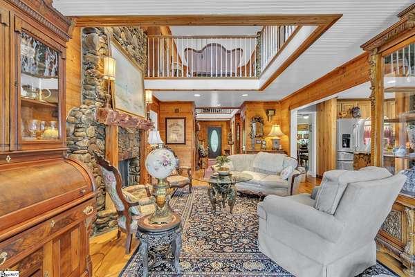Please call Anna Ryan | annaryan@kw.com | 864-770-3394 for inquiries. Custom built retreat on 2.39 private acres with a pond and long range views of Table Rock. Crafted by a master carpenter, this home showcases exceptional workmanship and thoughtful design throughout, blending rustic character with refined finishes. The interior features hickory cabinetry, cedar walls, rock accented details, and a dramatic two story stone fireplace. Upon entry, mountain views, an open concept layout, and a sweeping staircase create an immediate sense of space and connection to the setting. The eat in kitchen is designed for everyday living and entertaining, with an island, farmhouse sink, and upgraded stainless appliances. The main level primary suite offers a private retreat with dual vanities, a walk in shower, walk in closet, and quality finishes. Additional first floor spaces include a flexible room currently used as a secondary living area, a half bath, and a laundry room with built in storage. Upstairs includes an open bonus room, a sitting area with rock accents, two well appointed bedrooms, and a spacious bath featuring a clawfoot tub. A standout feature of the home is the approximately 1,000 square foot guest and entertainment space, complete with a kitchenette, built in office area, and room for recreation or gatherings. Just steps below is an additional open area with sauna, wood stove, a full bath with walk in shower, and access to a large covered deck overlooking the property. Car enthusiasts will appreciate the side entry four car garage with built in cabinetry, wood countertops, sink, ceiling fans, car runners, and carpeted flooring. Above the garage is a finished bonus space with wood floors, walls, and ceilings, a bedroom, and a comfortable hangout area with built in bookcase and fireplace heater. Outdoor living is equally well planned, featuring a wraparound porch, oversized stone courtyard and patio, detached storage shed, and additional storage beneath the covered patio. The setting offers privacy, scenic views, and outdoor spaces designed for entertaining while remaining low maintenance.