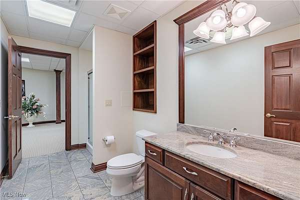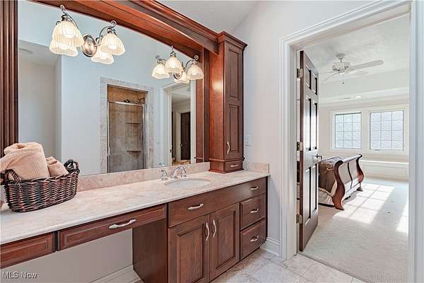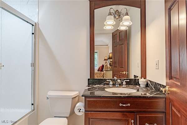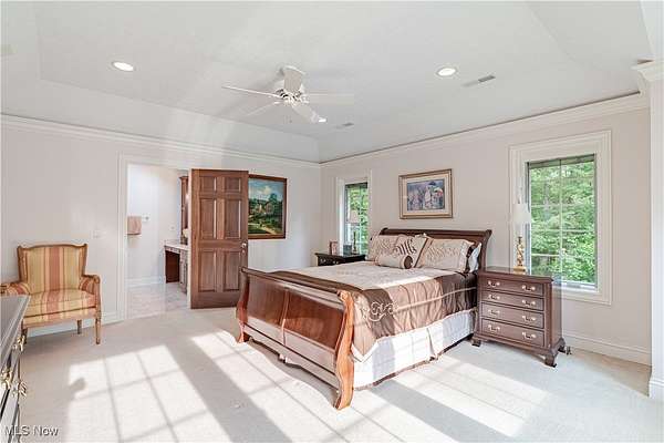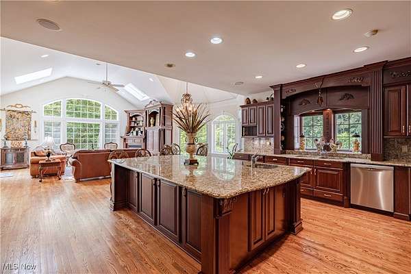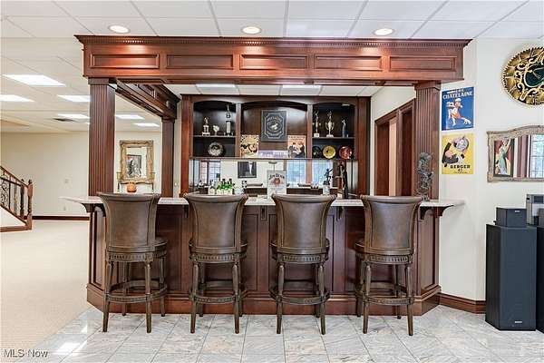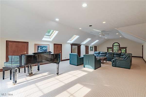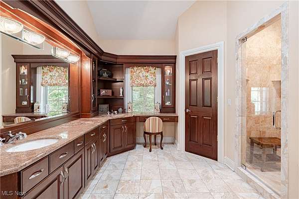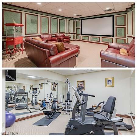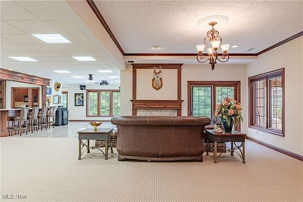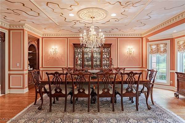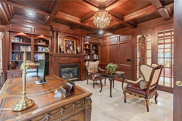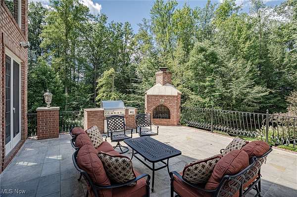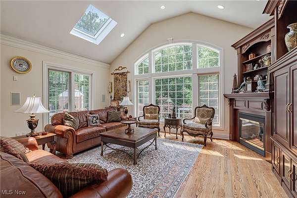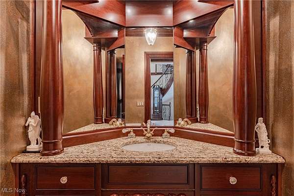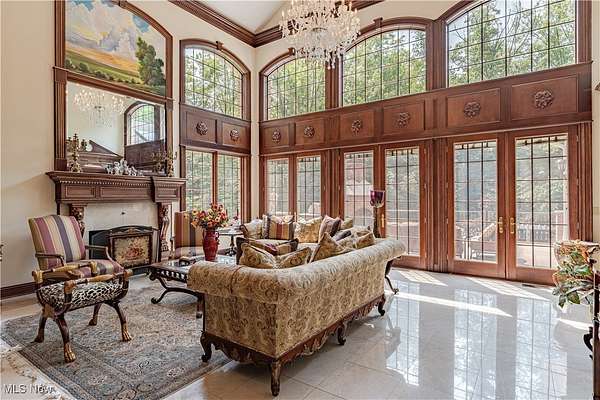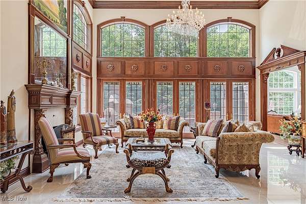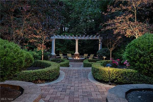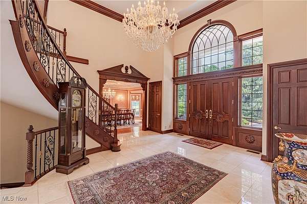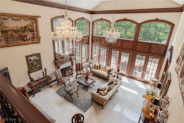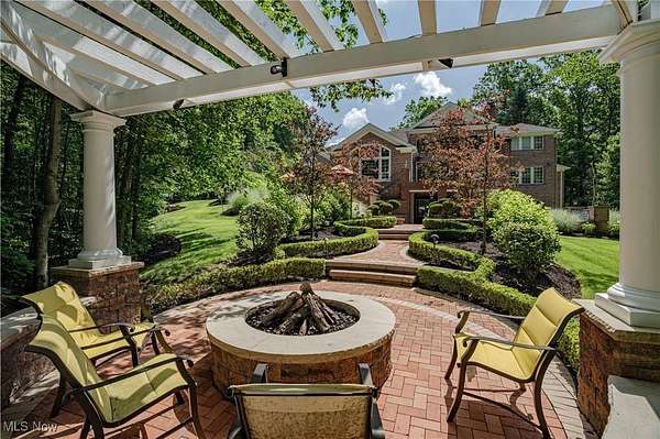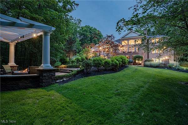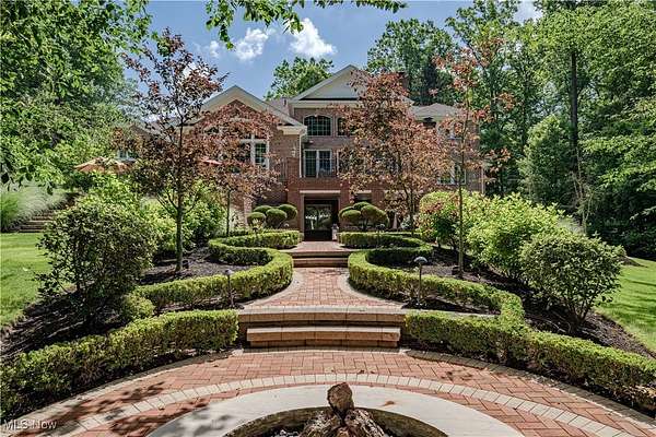 Privately nestled in Gates Mills, this breathtaking estate is a true showcase of elegance, craftsmanship, and refined living. A circular drive leads to a stately columned entrance with custom double doors, opening into a dramatic foyer with a dazzling chandelier and intricate millwork. The curved staircase features a custom Finelli Iron rail, and striking murals throughout the home were created by renowned artist Bob Dasher. The grand living room impresses with floor-to-ceiling windows, a statement fireplace, and a full wet bar-perfect for intimate relaxation. Just off the foyer, French doors open to a richly appointed office with coffered ceilings and custom-built-ins, while the formal dining room showcases classic wainscoting and elegant moldings. The gourmet kitchen impresses with a large island, granite counters, high-end appliances, custom cabinets, walk-in pantry, and a bright eat-in area open to the great room. The first-floor primary suite offers a peaceful retreat with a fireplace, dual walk-in closets, and a spa-like bath featuring a deep soaking tub, oversized shower, and double vanity. Upstairs, four spacious bedrooms each have private ensuite baths, and a large bonus room above the garage adds versatile living space. The finished lower level offers a resort-style experience, complete with a sixth bedroom, a stylish full bath, and an additional bath, featuring a steam room and sauna. You'll also find a spacious rec room with a wet bar and dance area, a billiards room that opens to an Old World-style wine cellar, a private theatre, and a full home gym. Outside, the grounds are spectacular-professionally landscaped with architectural design and meticulously crafted hardscaping. Multiple stone patios, a deck, an inground stone spa, a gas-powered outdoor fireplace, and a separate gas firepit create a five-star outdoor living experience year-round. Timeless architecture, exceptional amenities, and a premier Gates Mills location-Luxury living at its finest!