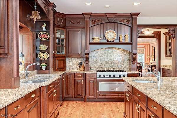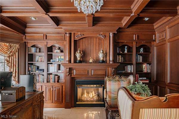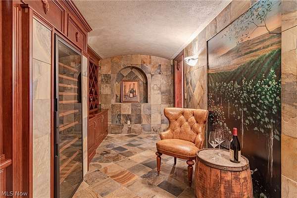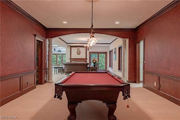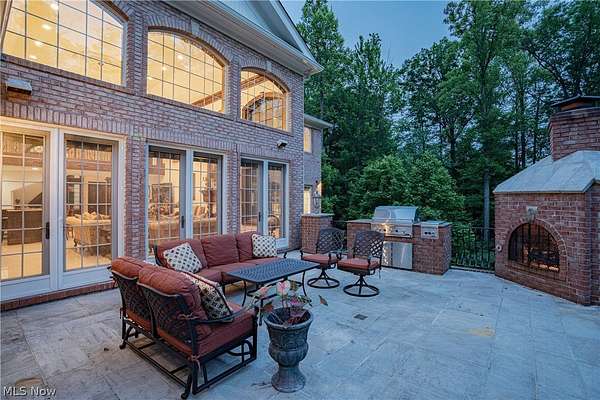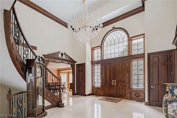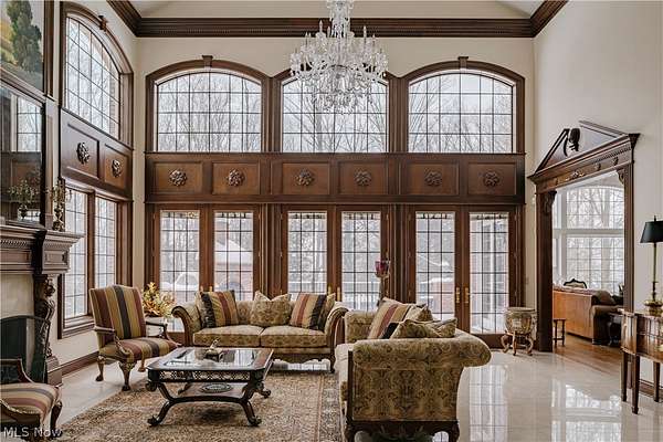 Privately nestled in Gates Mills, this breathtaking estate is a true showcase of elegance, craftsmanship, and refined living. A circular drive leads to a stately columned entrance with custom double doors, opening into a dramatic foyer with a dazzling chandelier and intricate millwork. The curved staircase features a custom Finelli Iron rail, and striking murals throughout the home were created by renowned artist Bob Dasher. The grand living room impresses with floor-to-ceiling windows, a statement fireplace, and a full wet bar-perfect for intimate relaxation. Just off the foyer, French doors open to a richly appointed office with coffered ceilings and custom-built-ins, while the formal dining room showcases classic wainscoting and elegant moldings. The gourmet kitchen impresses with a large island, granite counters, high-end appliances, custom cabinets, walk-in pantry, and a bright eat-in area open to the great room. The first floor primary suite offers a peaceful retreat with a fireplace, dual walk-in closets, and a spa-like bath featuring a deep soaking tub, oversized shower, and double vanity. Upstairs, four spacious bedrooms each have private ensuite baths, and a large bonus room above the garage adds versatile living space. The finished lower level offers a resort-style experience, complete with a sixth bedroom, a stylish full bath, and an additional bath, featuring a steam room and sauna. You'll also find a spacious rec room with a wet bar and dance area, a billiards room that opens to an Old World-style wine cellar, a private theatre, and a full home gym. Outside, the grounds are spectacular-professionally landscaped with architectural design and meticulously crafted hardscaping. Multiple stone patios, a deck, an inground stone spa, a gas-powered outdoor fireplace, and a separate gas firepit create a five-star outdoor living experience year-round. Timeless architecture, exceptional amenities, and a premier Gates Mills location-Luxury living at its finest!
