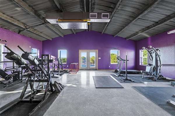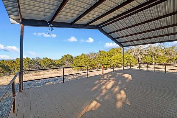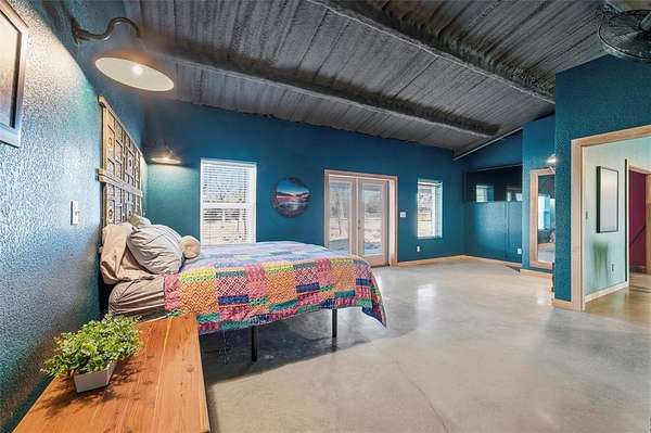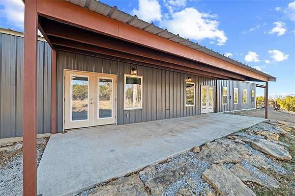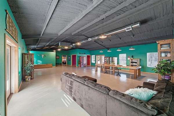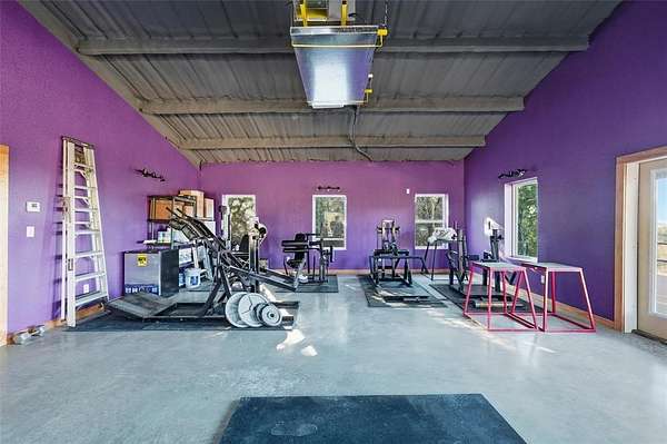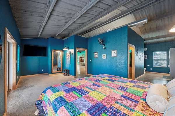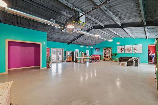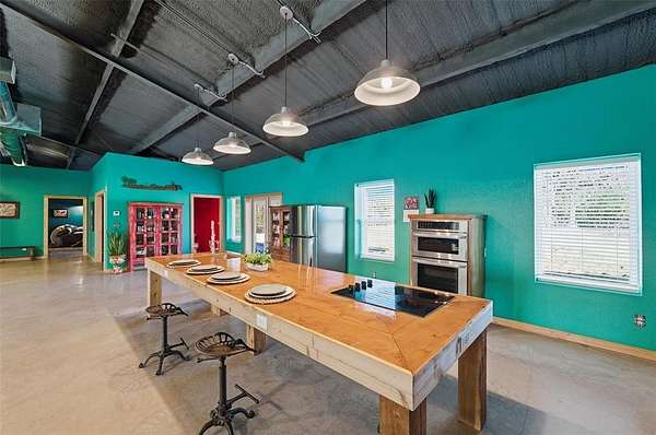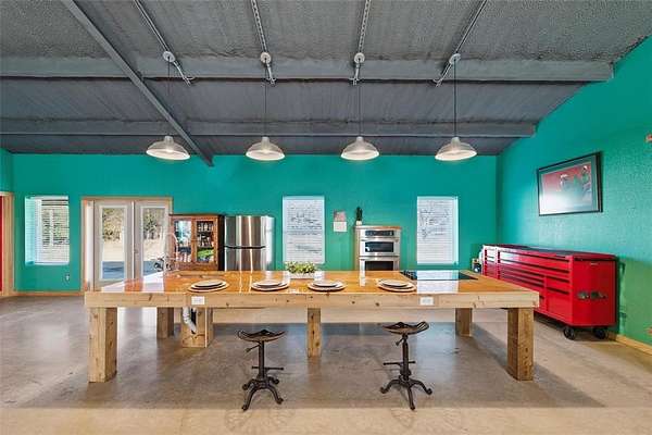 Wonderful and truly one-of-a-kind, this impressive barndominium offers over 3,000 sq ft of wide-open living space with 1 bedroom and 1.5 baths, all wrapped in a stunning modern industrial vibe. The heart of the home is the most beautiful kitchen table-counter you've ever seen--a true statement piece that anchors the space and makes it perfect for entertaining, gathering, or everyday living. An additional attached bonus room--currently used as a home gym--adds even more flexibility and features its own central heat and air system, making it ideal for an office, guest space, hobby room, or whatever fits your needs. Sitting on over 5 acres with Santo water, this property is fully fenced and cross-fenced and offered at an amazing price. A rare opportunity with style, space, and endless potential!