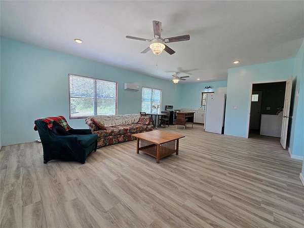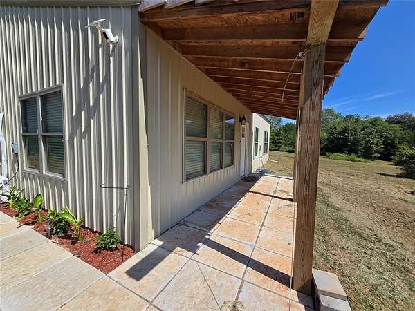 Escape to your own private retreat with this newer-built metal home, tucked away on a gated property in Tecumseh. Surrounded by mature trees, this charming residence blends modern efficiency with country living. Inside, you'll find an open-concept layout filled with natural light. The spacious living area features high ceilings, updated flooring, and a seamless flow into the dining and kitchen space-perfect for gathering and entertaining. The kitchen offers ample counter space, fresh cabinetry, and stainless-steel appliances, while a rustic island adds a touch of character. This home includes 3 bedrooms and 2 full bathrooms. The primary suite is complete with a walk-in shower, while the secondary bath features a sleek soaking tub for relaxation. Both bathrooms have been thoughtfully finished with modern fixtures. Enjoy evenings on the covered front porch or take in the peaceful wooded backdrop from the wide concrete patio. The gated drive adds extra privacy, making this property an ideal getaway or full-time residence. With its efficient metal construction, fresh finishes, and serene setting, this Tecumseh home offers low-maintenance living in a quiet country atmosphere-all just a short drive to town conveniences.