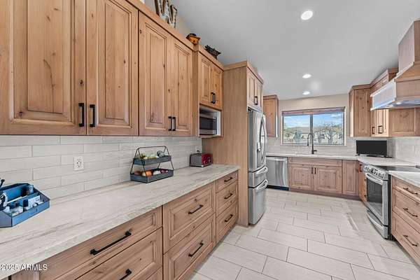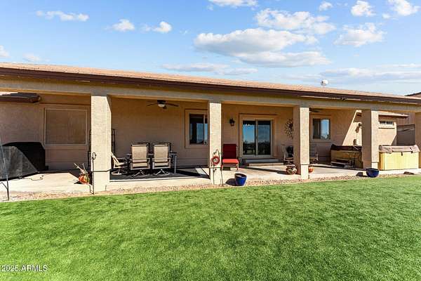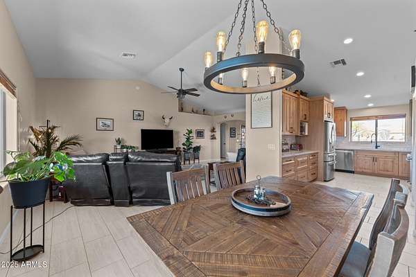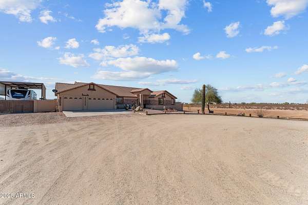 Welcome to your new home on 2.5 acres ready for you to bring your dream horse setup to life! Fenced on 3 sides with a spacious circular drive makes parking multiple vehicles or maneuvering trailers a breeze. Water Heater and A/C were replaced 4/26 Step inside and be captivated by soaring vaulted ceilings in the great room, creating a light and airy atmosphere perfect for relaxing or entertaining. The kitchen is a showstopper, featuring rich knotty alder cabinetry with all lower drawers for easy access, paired with luxurious Taj Mahal honed quartzite countertops. All three bathrooms have been tastefully remodeled, comfort height vanities, updated mirrors, lighting and along with tile surrounds in shower. The primary suite includes a beautifully designed walk-in shower with rainhead shower system, bench, niches as well asand a freestanding soaking tub for your personal spa experience. One of the bedrooms is split from the main living and conveniently located near a full bath with a zero entry/roll in shower - ideal for guests or multi-generational living. Out back, you'll find a spacious, fully block-fenced yard with a hot tub, 2,800 sq ft of low-maintenance synthetic grass, and a versatile RV/pole barn shade structure. Two RV gates provide easy access, and beyond the block wall, approximately 100 feet leads to the back property line. An additional cleared acre to the west with 340 feet of top rail, no climb fencing is ready for your custom arena or expansion ideas. Don't miss this rare opportunity to own a stunning home with room to enjoy - whether it's horses, hobbies, or simply space to breathe, this one offers you all the opportunity! 1 year comprehensive home warranty will be included with the purchase of this home.