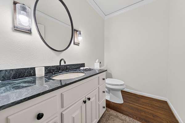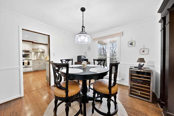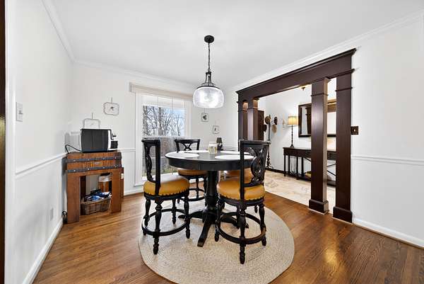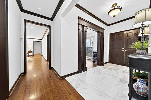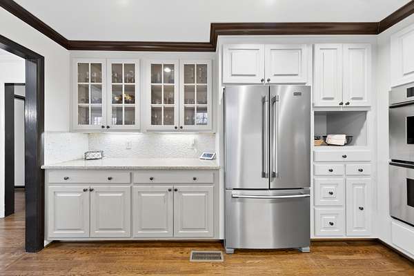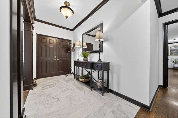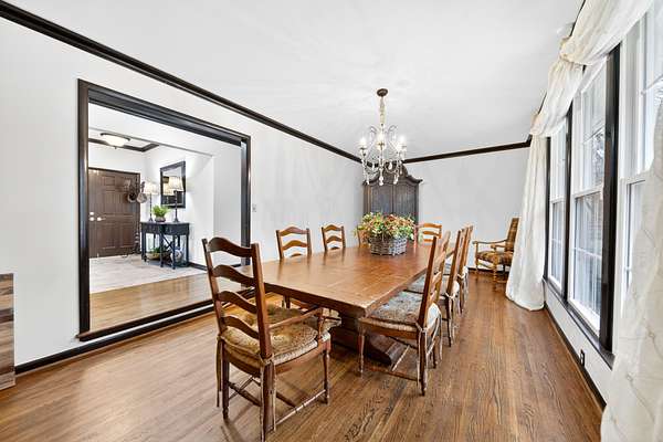 The 2,663 sq. ft. residence features three bedrooms, 2.5 baths, and a functional floor plan with both formal and informal living spaces. A charming marble entry foyer welcomes you inside, while a covered front porch and rear patio provide inviting outdoor living areas overlooking the mature trees and spacious backyard. The two-car garage includes oversized storage, and the extended driveway allows for ample additional parking.