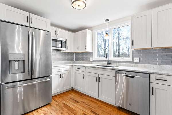Whether you prioritize the convenience of Maine's lakes and mountains or seek an escape from Portland's suburban expansion, North Gorham Road's location is certain to be a delight. This newly renovated 3-bedroom, 1.5-bathroom 1970's gambrel features all the contemporary comfort of modern construction over three levels of refined living space. Bright windows, new flooring, and fresh paint throughout create a welcoming ambiance. The updated kitchen and bathrooms are sure to impress with stainless appliances, granite countertops, ample closet space, and first floor laundry. A new roof, driveway and vinyl siding ensure years of effortless maintenance to come. Situated on a partially wooded and sunny 5-acre lot with a fenced backyard, new deck, private hot tub, and plenty of space to embrace the ever changing seasons, this home is the ideal combination of comfort and outdoor enjoyment. A walkout basement with two flex spaces, wood burning fireplace, and private sauna further enhances this property's amenities.