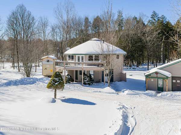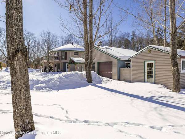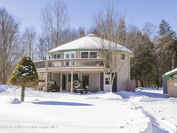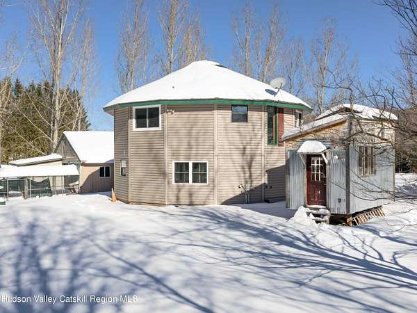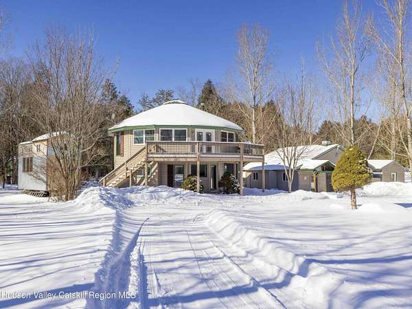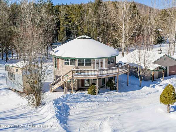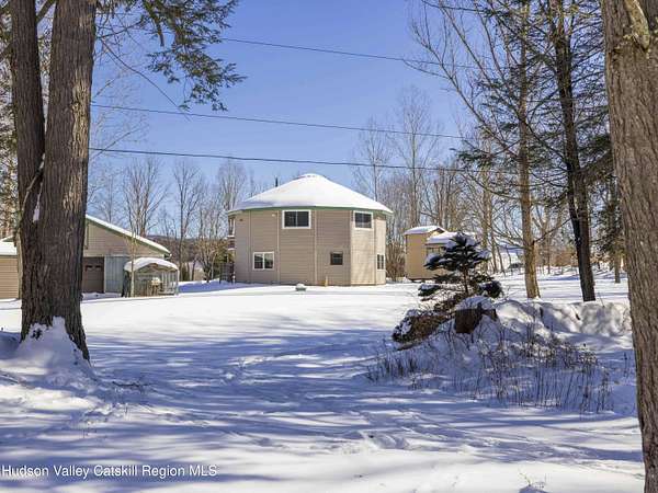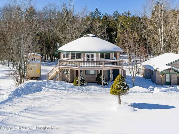 Incredible buy at this new price! The Windham Round House, one of most distinctive and architecturally unique homes in the area. Lovingly designed and built by the original owners, this octagon-style residence sits on 5 private acres with open lawns, a charming stone wall, evergreen woods beyond, multiple outbuildings including a two-car garage-offers a remarkable setting that must be seen to be fully appreciated. As you enter the Round House's first floor, you immediately notice the striking wood-beamed ceiling that follows the home's distinctive circular design. A welcoming foyer provides space for a mudroom setup, and the open circular living area works well as a second living room, den, or home office. This level also includes two comfortable bedrooms connected by a Jack-and-Jill bathroom, a utility closet with a Rinnai heating system, and a separate washer/dryer closet. Upstairs, the home's round architecture truly takes center stage. Walls of glass invite abundant natural light and frame beautiful distant mountain views. Double glass doors open to a large wraparound deck, ideal for lounging, BBQs, and easy outdoor access via the staircase to the yard. The open-concept kitchen, dining, and living area creates a seamless gathering space, complete with a convenient half bath. A charming woodstove anchors the room, offering cozy ambience and an excellent auxiliary heat source. The upstairs ceiling features a beautiful medallion positioned at the center of the house, emphasizing the circular design and flow of energy throughout the space. This level also hosts the spacious primary bedroom with its own private full bath and double walk-in closets. The outdoors are equally impressive, with flat, manicured lawns, open play areas, and walking trails that extend into your private evergreen forest. A large workshop with electric, connects directly to a two-car garage-suitable for vehicles, and equipment, the space is a dream setup for hobbyists or builders. Off the garage is a fenced-in dog kennel with swinging-door access, offering an excellent setup for pets. An additional shed provides the perfect canvas for a studio. For added charm, you'll find a well-crafted tree fort tucked into the woods and a converted horse trailer that can be used for overnight guests. Just minutes from Windham's Main Street, restaurants, shops, and the Windham Mountain Club, this property combines peaceful country living with convenient access to town. Perfect for full-time living, a vacation getaway, or rental/investment use, this unique home in a sought-after area offers unlimited potential. Well maintained-just bring your vision and design and make this rare Windham gem your own. A must-see! A 3D Walkthrough Tour is available in the digital Lookbook or by request.