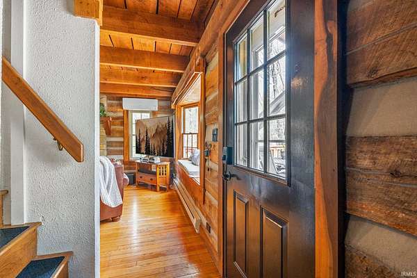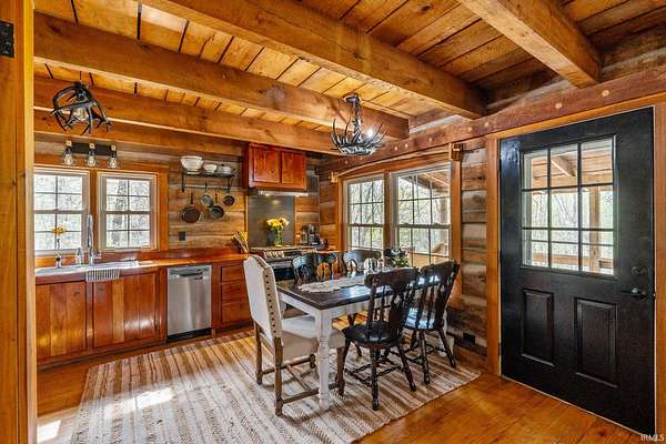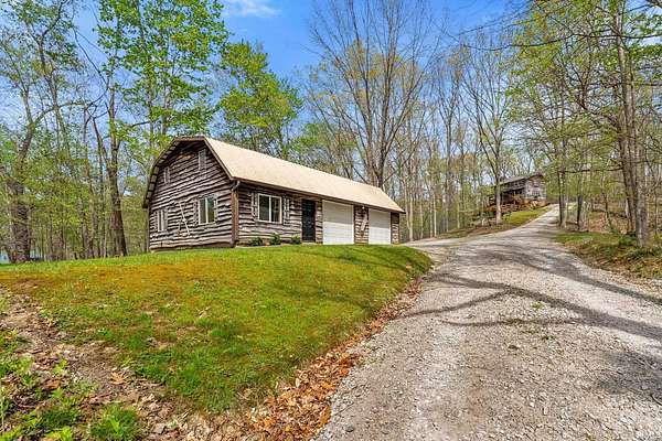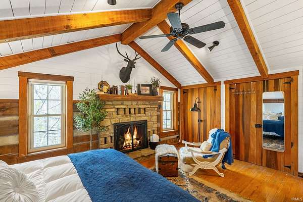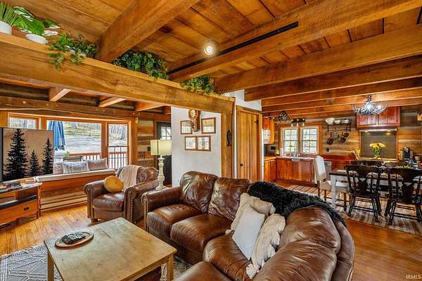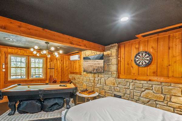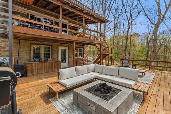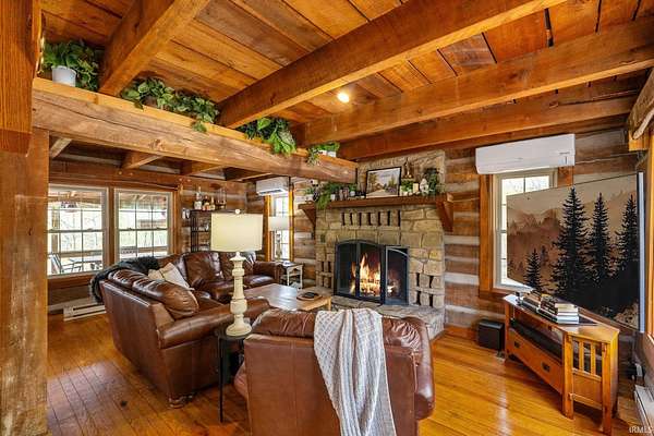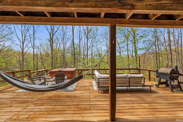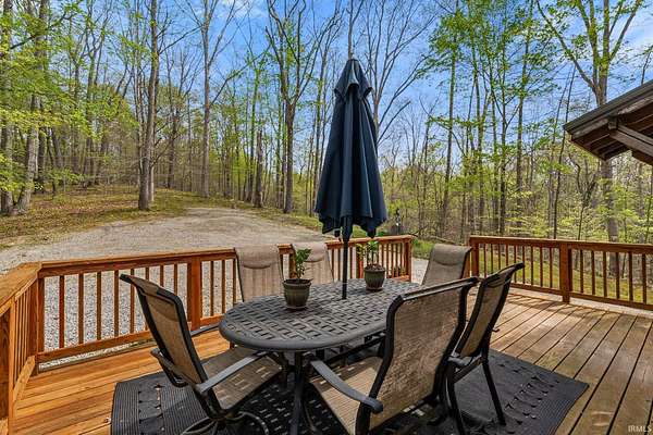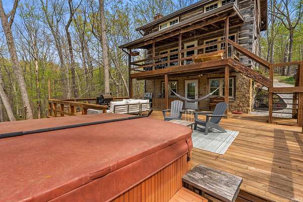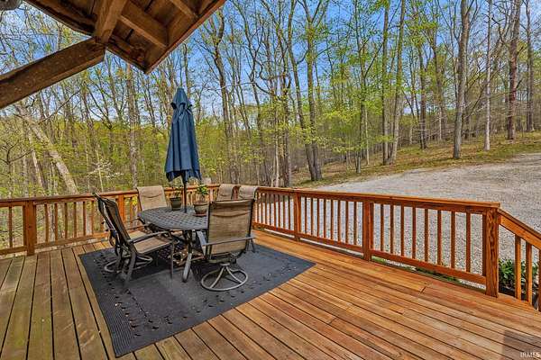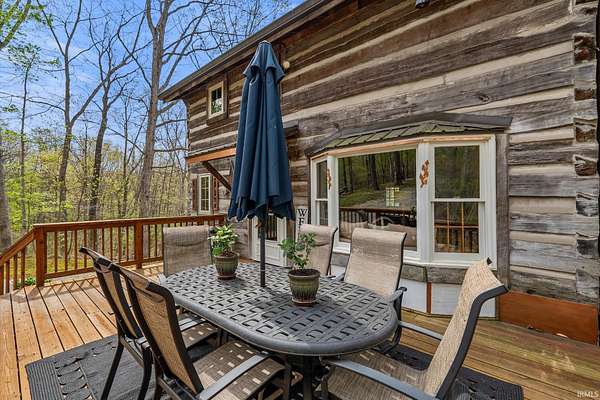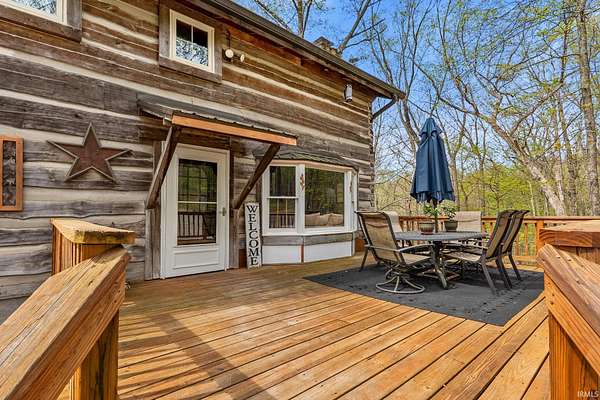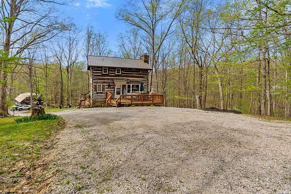 Lost & Found Cabin offers a rare opportunity to own a true Brown County log home with a Tourist Rental Exception already in place. Although it has not been used as a short-term rental since 2019, the exception remains, and the current owners hold a valid permit—allowing you to begin renting immediately. Set on 5 private wooded acres, this custom-built log cabin blends rustic charm with modern updates. Enjoy peaceful views from every window, relax on multiple decks, or unwind in the hot tub surrounded by nature. Inside, you'll find hardwood floors, exposed beam ceilings, poplar hardwood doors and trim, mortise locks and hardware, custom hardwood countertops, and two gas log fireplaces—one in the living room and one in the primary bedroom. The finished basement expands the home’s functionality and entertainment space, featuring a pool table along with additional sleeping options including a Murphy bed and sleeper sofa—ideal for guests or short-term rental flexibility. The home is being sold fully furnished, including all kitchen dishes, cookware, and essentials, making it truly turnkey. Recent updates include a beautifully renovated kitchen, new stainless steel appliances, new mini-split heating and cooling units throughout the home (including the garage), and updated basement flooring. Outdoor living is just as inviting, with both a gas fire pit and a wood-burning fire pit for year-round enjoyment. The 30' x 40' detached garage offers excellent versatility with new windows, an upper-level storage area, and a 30' x 15' finished room perfect for a workshop, studio, gym, or hobby space. A low-maintenance metal roof adds peace of mind, and additional inclusions such as a generator, extra freezer in the garage, and Traeger grill further enhance the value. If you've been dreaming of a private cabin in the woods with income potential, modern comforts, and authentic Brown County character, Lost & Found Cabin is a must-see.
