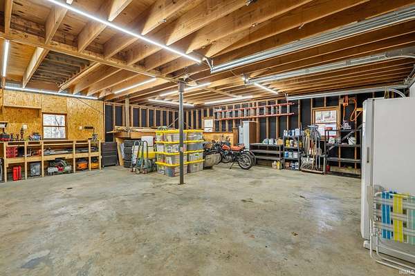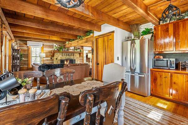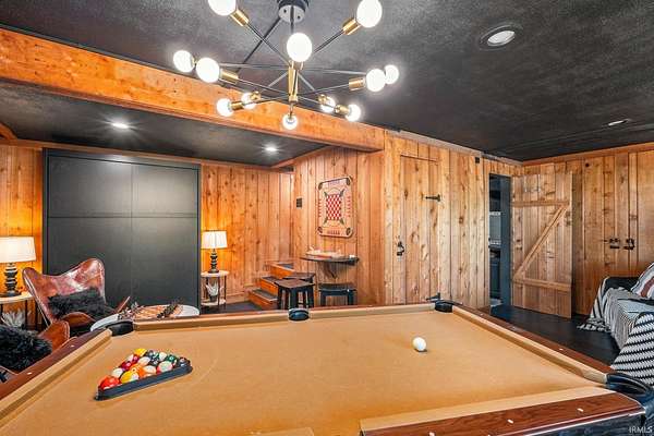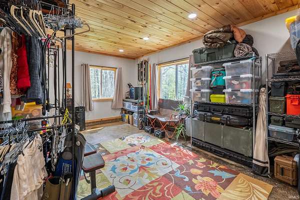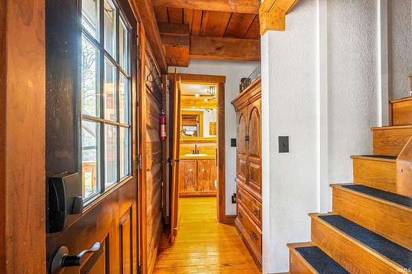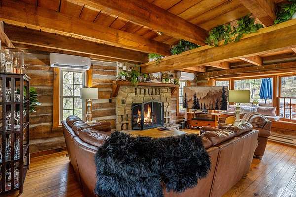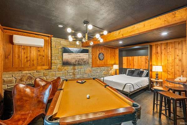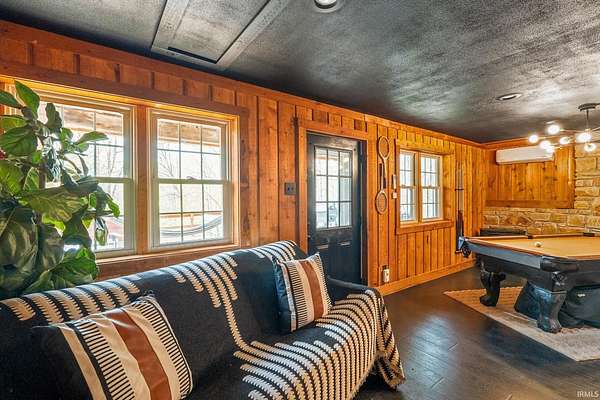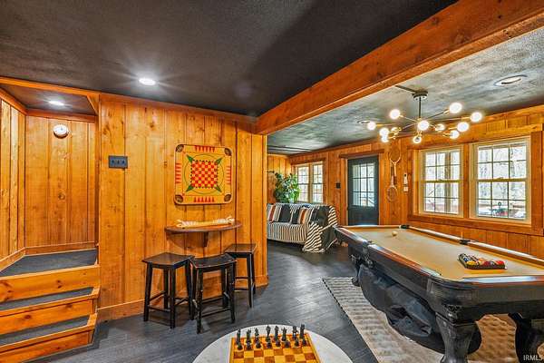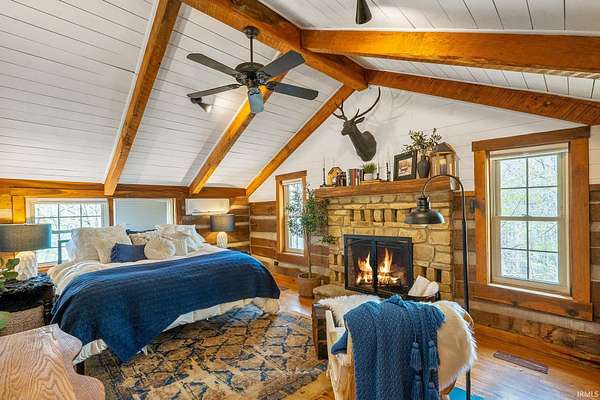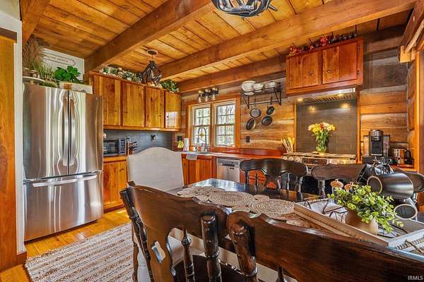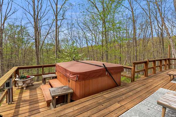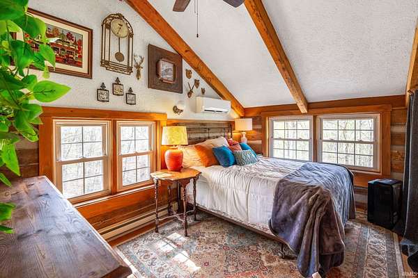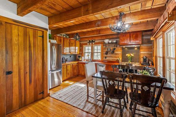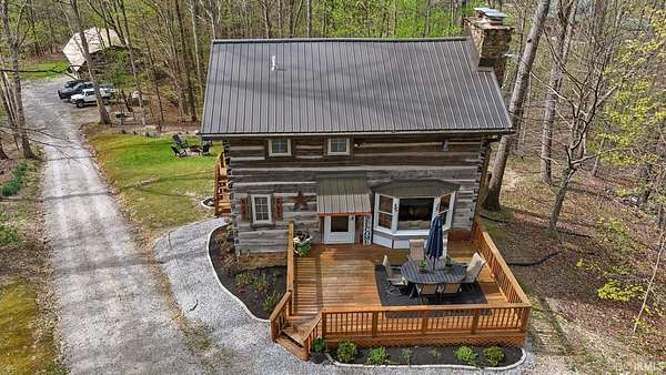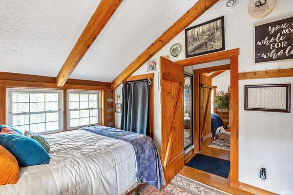 Lost & Found Cabin offers a rare opportunity to own a true Brown County log home with a Tourist Rental Exception already in place. Although it has not been used as a short-term rental since 2019, the exception remains, and the current owners hold a valid permit—allowing you to begin renting immediately. Set on 5 private wooded acres, this custom-built log cabin blends rustic charm with modern updates. Enjoy peaceful views from every window, relax on multiple decks, or unwind in the hot tub surrounded by nature. Inside, you'll find hardwood floors, exposed beam ceilings, poplar hardwood doors and trim, mortise locks and hardware, custom hardwood countertops, and two gas log fireplaces—one in the living room and one in the primary bedroom. The finished basement expands the home’s functionality and entertainment space, featuring a pool table along with additional sleeping options including a Murphy bed and sleeper sofa—ideal for guests or short-term rental flexibility. The home is being sold fully furnished, including all kitchen dishes, cookware, and essentials, making it truly turnkey. Recent updates include a beautifully renovated kitchen, new stainless steel appliances, new mini-split heating and cooling units throughout the home (including the garage), and updated basement flooring. Outdoor living is just as inviting, with both a gas fire pit and a wood-burning fire pit for year-round enjoyment. The 30' x 40' detached garage offers excellent versatility with new windows, an upper-level storage area, and a 30' x 15' finished room perfect for a workshop, studio, gym, or hobby space. A low-maintenance metal roof adds peace of mind, and additional inclusions such as a generator, extra freezer in the garage, and Traeger grill further enhance the value. If you've been dreaming of a private cabin in the woods with income potential, modern comforts, and authentic Brown County character, Lost & Found Cabin is a must-see.