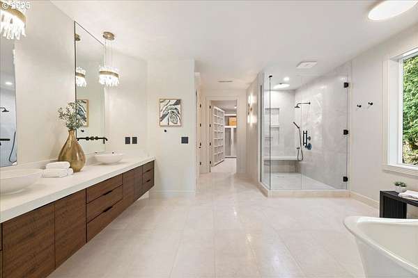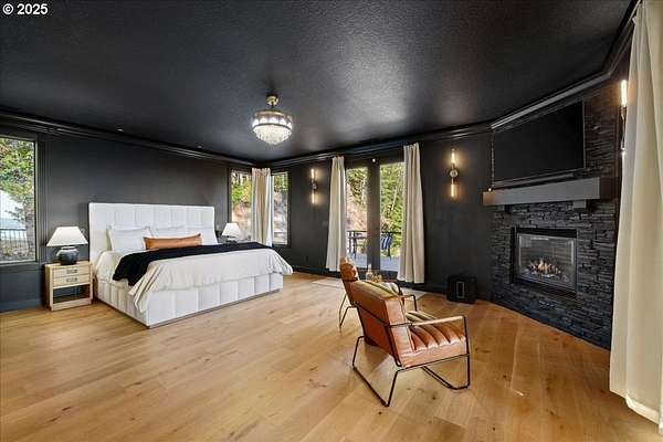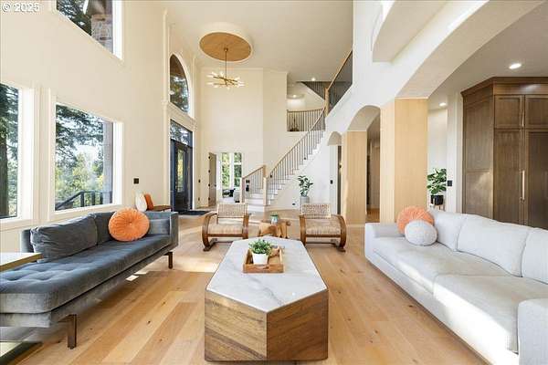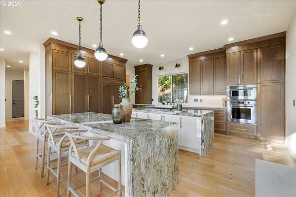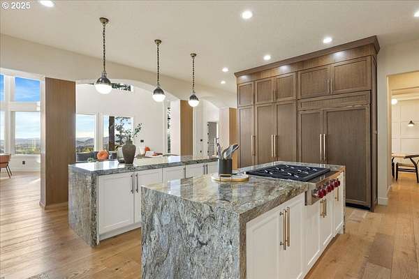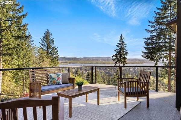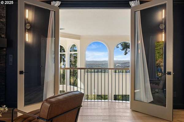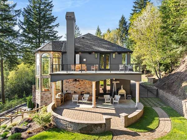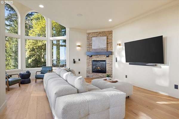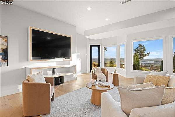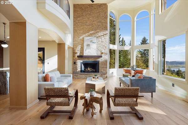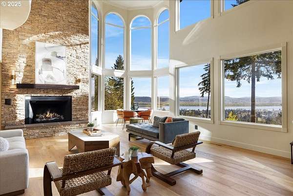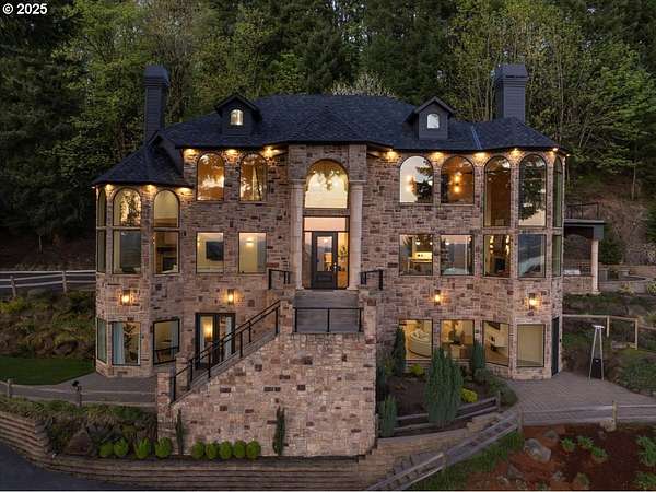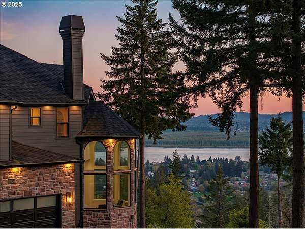 Breathtaking Columbia River and city views from this stunning "mansion on the hill," extensively remodeled with the highest quality materials and no detail overlooked. Enjoy complete privacy with a long gated driveway and no neighbors in sight. The grand entry features soaring ceilings and south-facing windows that flood the home with natural light. Gorgeous hardwood floors span the main level, leading to a gourmet kitchen with two islands, double ovens, a Wolf cooktop, built-in Sub-Zero refrigerator, hidden walk-in pantry, and abundant storage. The dramatic living room boasts a floor-to-ceiling fireplace, while the main-level den or office offers a second fireplace. A spacious dining room easily accommodates large gatherings. The luxurious primary suite includes a spa-like bathroom with a large tiled shower, soaking tub, impressive walk-in closet, and French doors opening to a private terrace. Upstairs, two additional large bedrooms each feature ensuite bathrooms. The custom theater room includes tiered seating, a wet bar, high-end projector, and surround sound. The lower level is perfect for extended living, complete with a full kitchen featuring Bertazonni appliances, living room, bedroom, bathroom, wine cellar, and private entrance. The entire home is wired for premium Sonos sound. A covered patio with fireplace, heaters, and an outdoor kitchen creates the ultimate entertaining space, complete with a tranquil water feature and expansive views. Additional highlights include a three-car attached garage with ample storage, new dual-zone HVAC systems, and a new 80-year presidential roof. A large finished shop offers space for business or RV storage, with separate living quarters above featuring a full kitchen, bathroom, and bedroom. Must see to truly appreciate the views, luxurious finishes, and exceptional quality throughout. $2M in upgrades - ask for details. See links for video & 100+ photos.