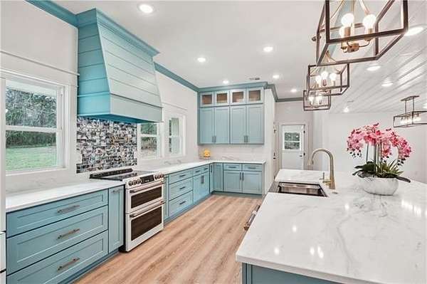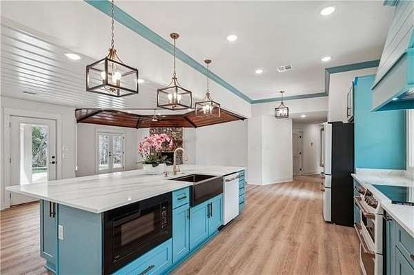 Inside, natural light fills a thoughtfully designed floor plan that honors the home's heritage while incorporating today's finest updates. The chef's kitchen serves as the heart of the home, showcasing GE Cafe appliances, quartz countertops, a massive 10x6 island, an oversized walk-in pantry, and ample prep space, perfect for everyday living or entertaining.
