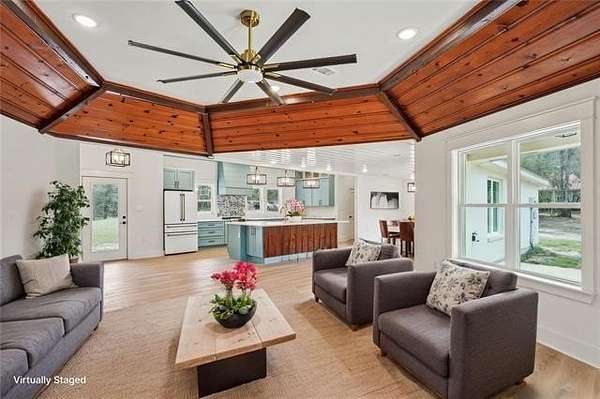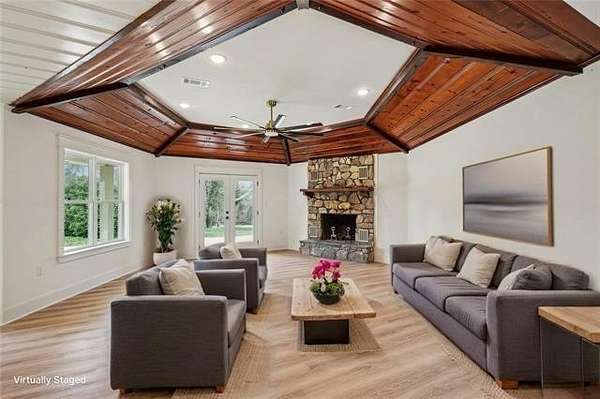 Two spacious primary suites offer flexible living arrangements for guests, extended family, or private retreats. Elegant details throughout include wood-clad ceilings, a dramatic cypress mantle, and a stunning stone fireplace crafted by the original owner from hand-collected stones.