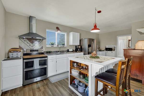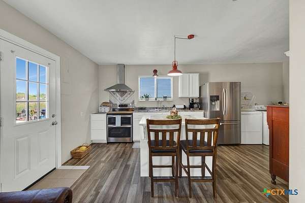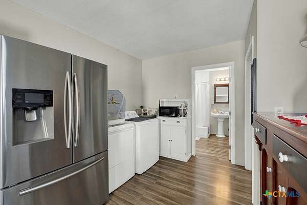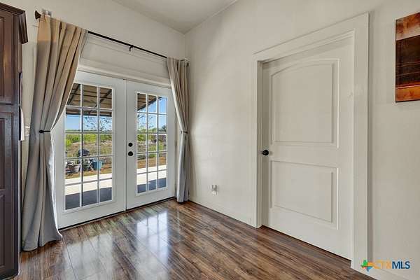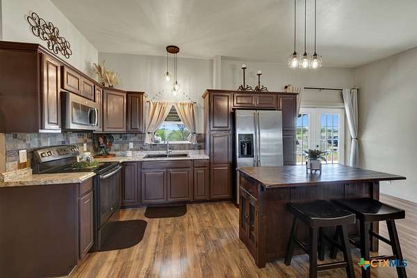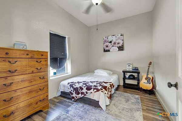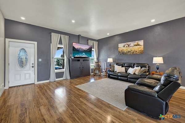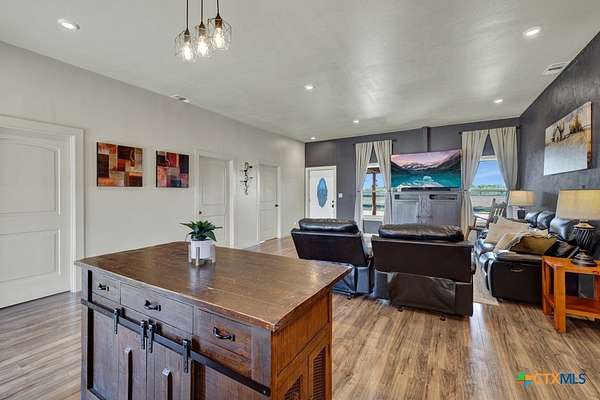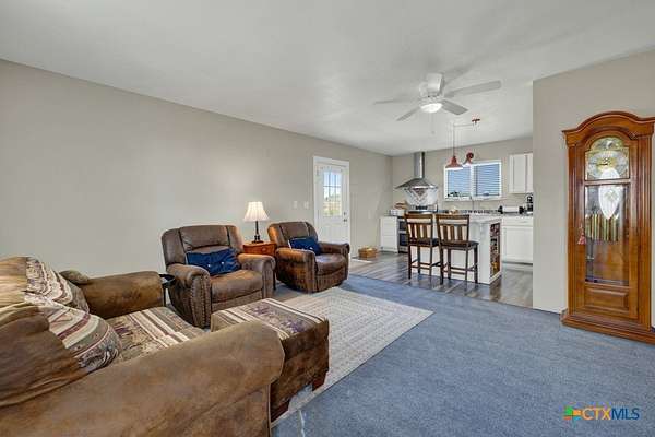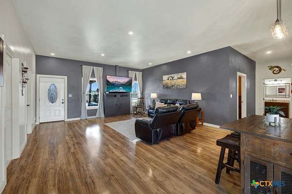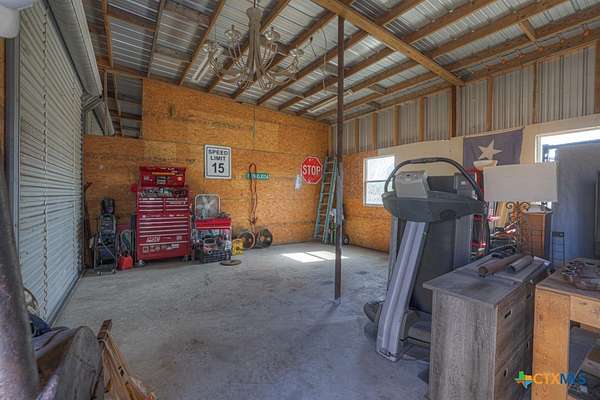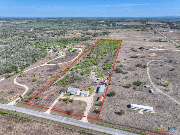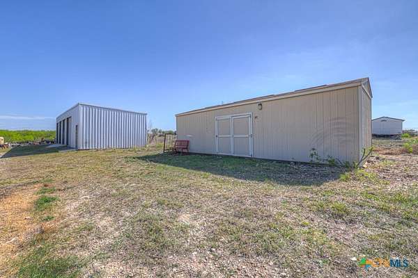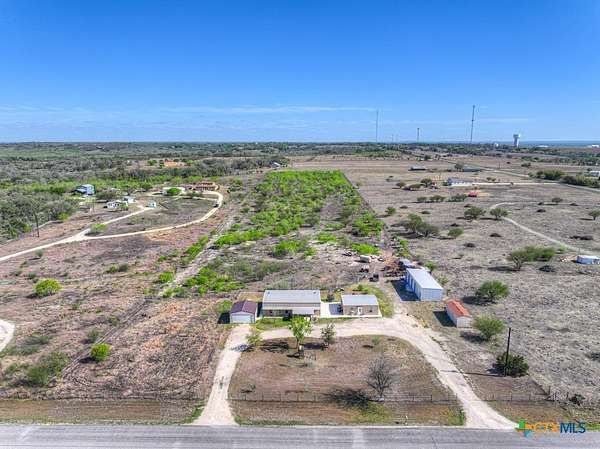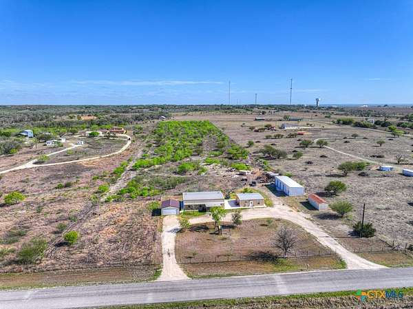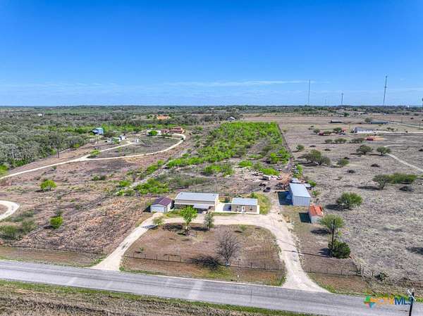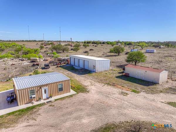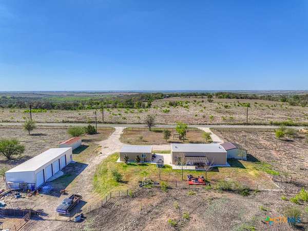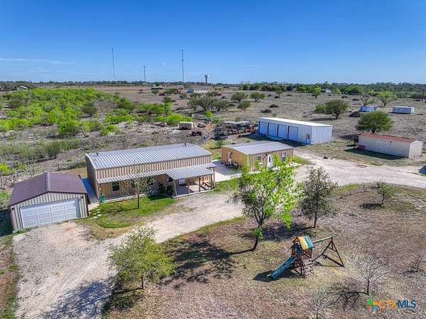 Discover 10 unrestricted acres offering exceptional access and dual residences-an ideal opportunity for those seeking space, flexibility, and scenic surroundings. The custom-built barndominium features durable 9-inch exterior insulated walls, with additional insulation in the attic and between interior walls for enhanced comfort and efficiency. The main home includes 1500 sq ft., four bedrooms, and an open-concept design, allowing for versatile living arrangements. The absence of built-in closets provides the freedom to customize storage solutions, whether through armoires or the addition of tailored closet spaces. The guest house is 750 sq ft, equally well-constructed and offers a spacious bedroom and bath, along with an inviting open layout that seamlessly connects the living, dining, and kitchen areas-perfect for extended family or guests. Step outside either residence to enjoy consistent breezes, as the property is situated along one of the highest elevations in the county. Take in expansive views stretching toward San Marcos, Seguin, and the surrounding countryside. The front portion of the property features a 24x30 garage suitable for multiple vehicles, as well as a five-bay 20 x 60 workshop with 10' roll-up doors, and is ideal for projects, storage, or business use. Additional amenities include two RV hookups and full perimeter fencing. With abundant space and flexibility, the property offers endless potential-whether continuing the established wildlife sanctuary or creating your own outdoor retreat.