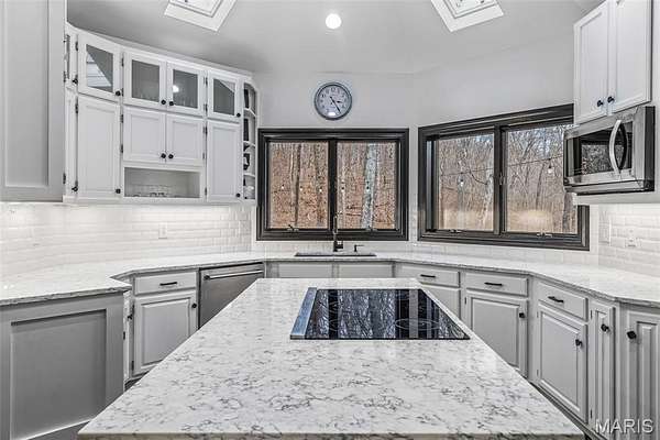 Wake up to a $10M VIEW for under $1M in this truly special, one-of-a-kind raised RANCH in Wildwood, located in the AWARD-WINNING Rockwood School District. Set high on 3.19 serene acres, this home captures breathtaking views through dramatic floor-to-ceiling windows and offers privacy, beauty, and a true sense of retreat. Thoughtfully updated with a warm modern style, highlights include a stunning kitchen with QUARTZ countertops, custom cabinetry, walk-in pantry, STACKED-STONE fireplace, wide crown molding, soaring ceilings, iron stair rail, newer flooring and lighting, beautifully updated bathrooms, and the convenience of main floor laundry. The LUXURIOUS primary suite features an ensuite and custom iron-forged doors as well as a private sitting room with a GORGEOUS view. The lower level is well underway with framing, electrical, some insulation, and select drywall taped and primed, plus an exercise area ready for your vision. Step outside to enjoy a beautifully landscaped backyard patio, perfect for relaxing or entertaining while taking in the peaceful surroundings. Enjoy peace of mind with a new HVAC system along with a newer pump and line for the well. The oversized 2-car garage offers an epoxy floor, newer garage door, and a Tesla electric vehicle charging station. Come see all the uniqueness and possibilities this home has to offer and fall in love with this BEAUTY. Home is being sold As-Is.