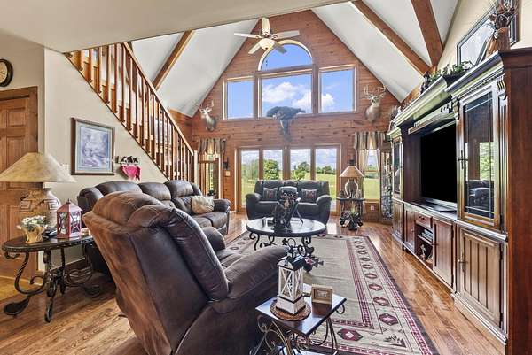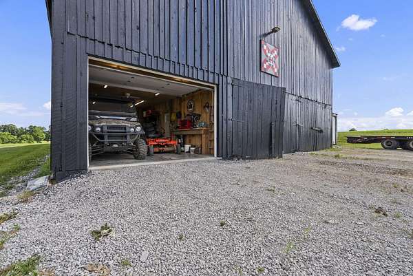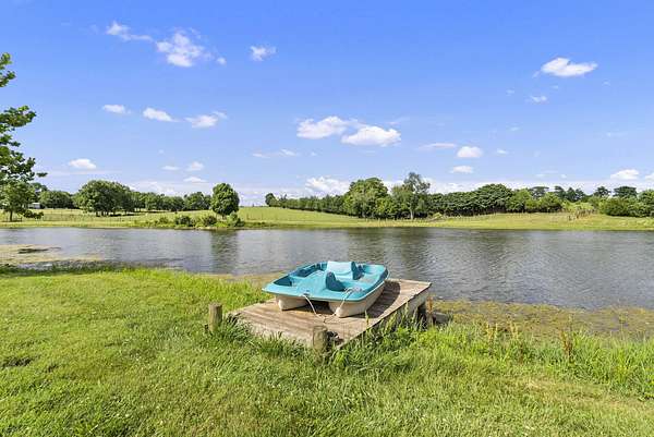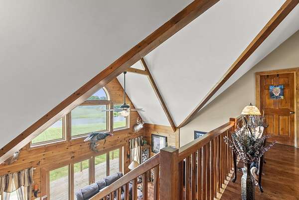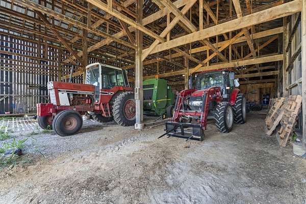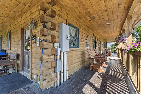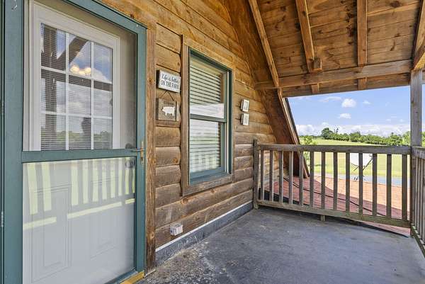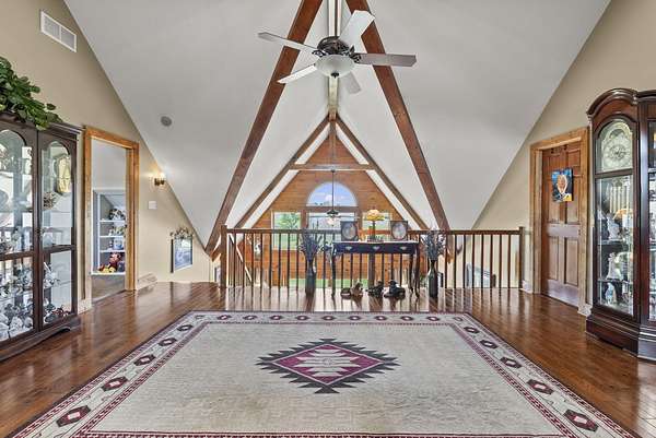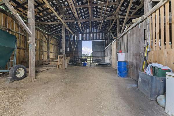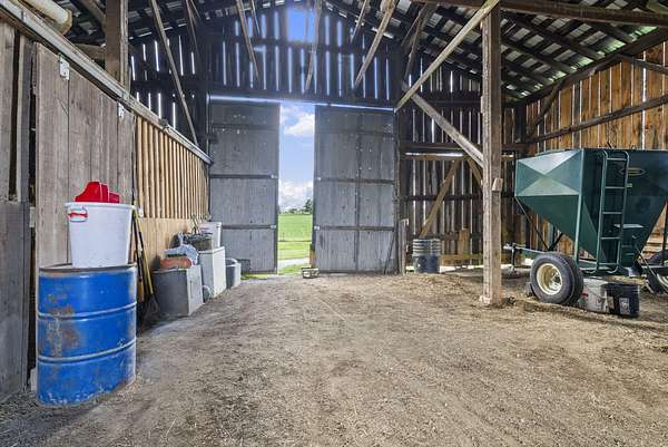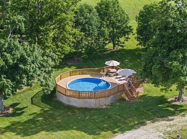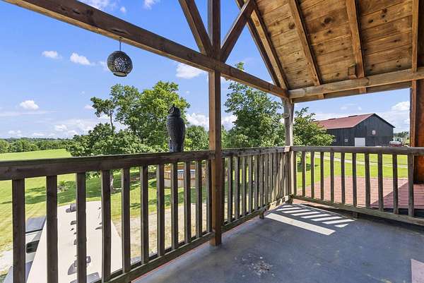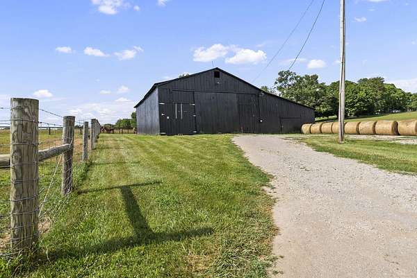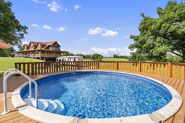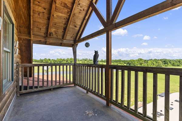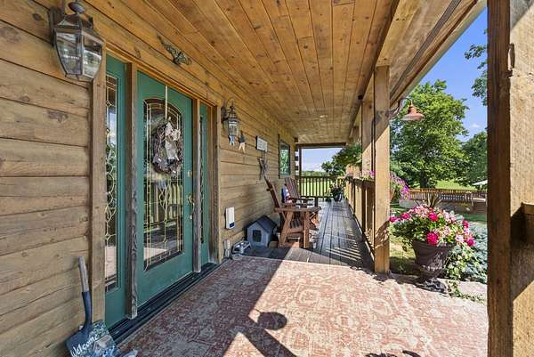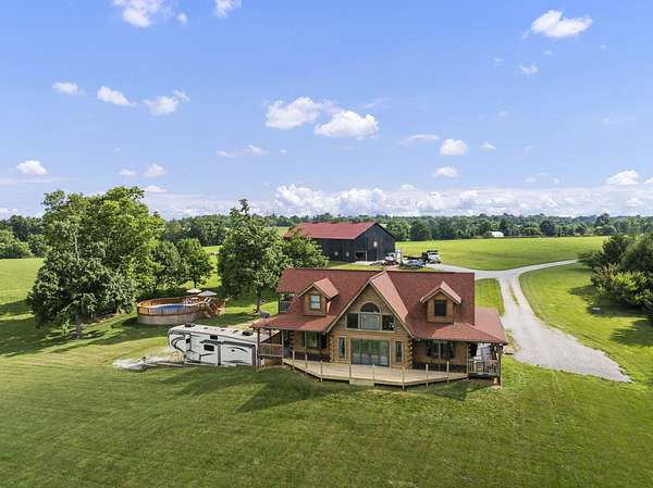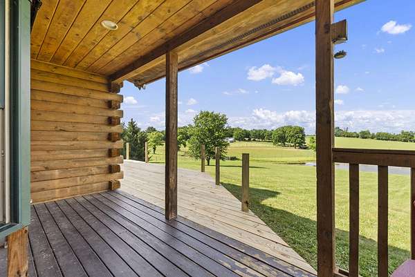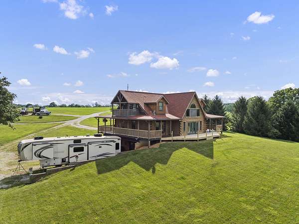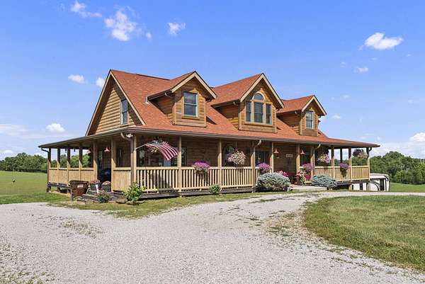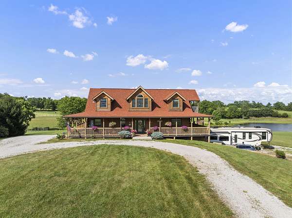 Welcome to your dream country retreat! This beautifully crafted 1.5-story log home offers the perfect mix of rustic charm and modern amenities on 44.21 picturesque acres with a private lake view-enjoy it right from your spacious front porch. With 3,585 sq ft, this home features 5 bedrooms, 4 full baths, a main-level primary suite, office and first floor laundry for everyday ease. The walk out basement includes a large re area and a pellet stove for cozy winter nights. Outdoors, the property is fully equipped for both recreation and functionality. Two barns, one with electric, water and insulated workshop. Above ground pool with custom foam-matted bottom, deck and FROG system. New fencing and gates plus automatic waterers in 2 fields-ideal for livestock. Geothermal heating and air, new roof, and energy-efficient features throughout. This rare property offers space, privacy, and unmatched versatility-perfect for homesteading, hobby farming, or simply enjoying peaceful country living.20 minutes to Toyota.
