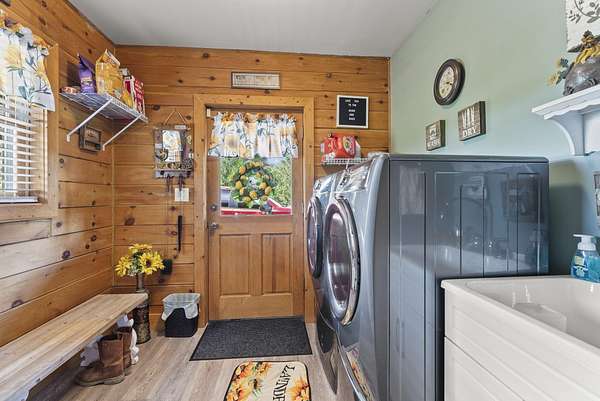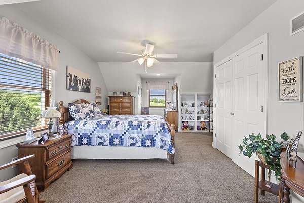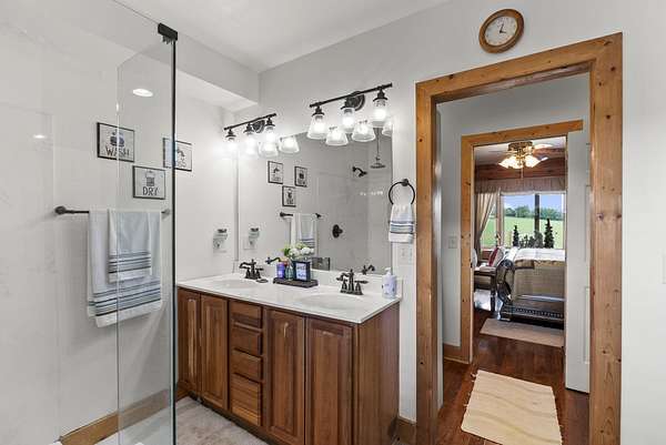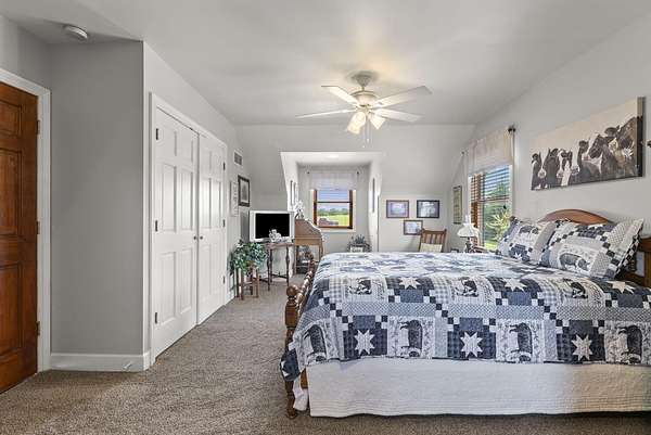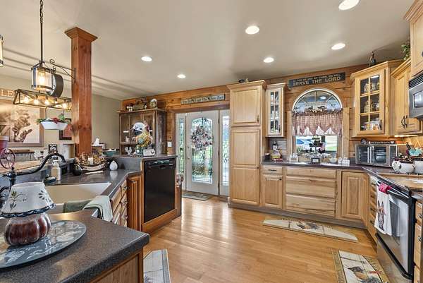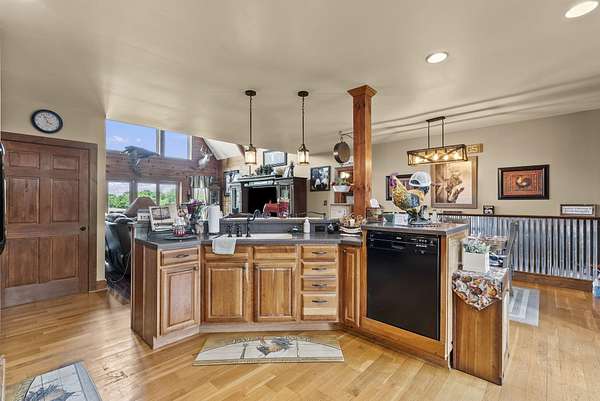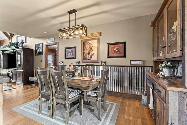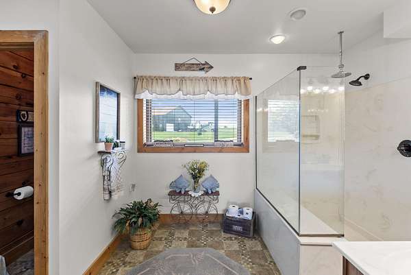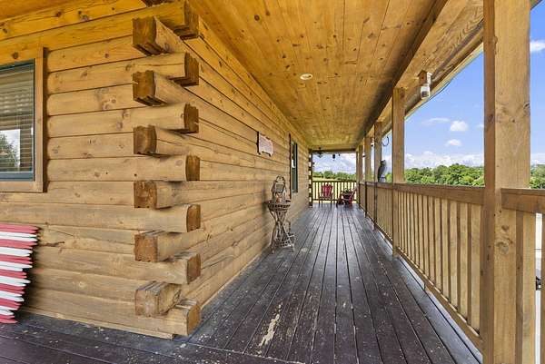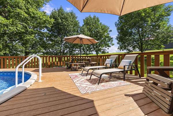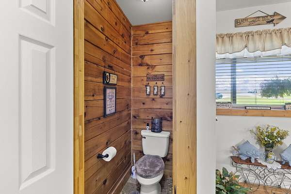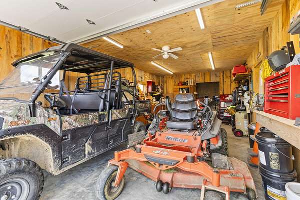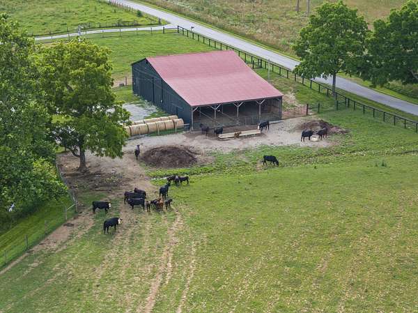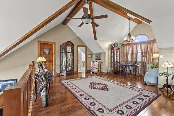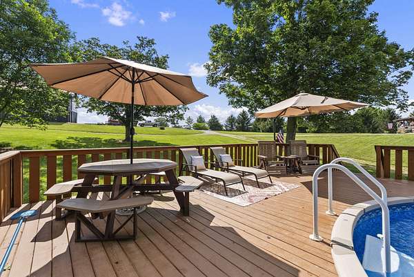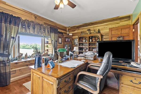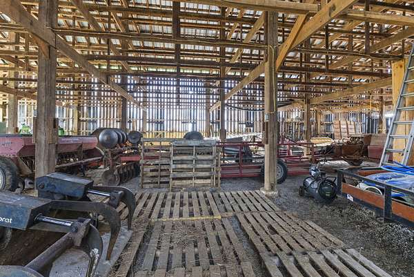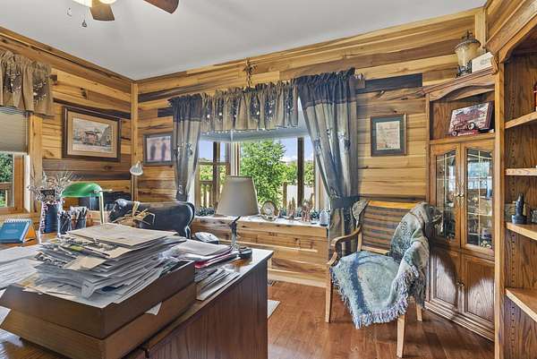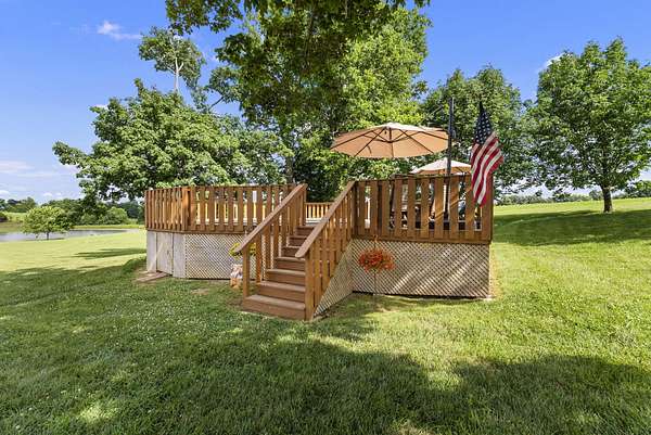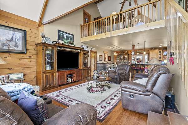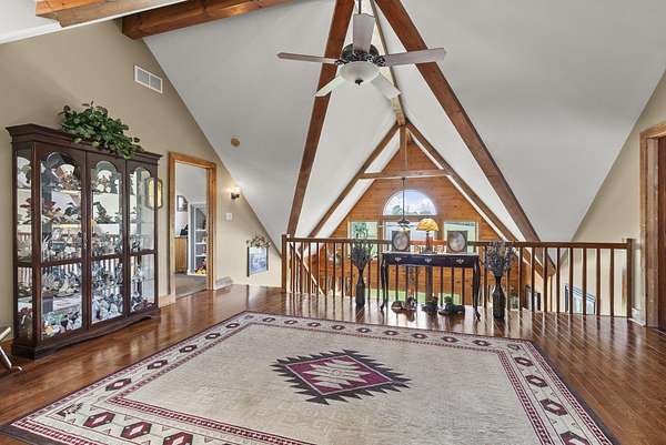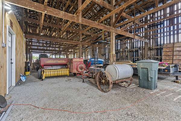 Welcome to your dream country retreat! This beautifully crafted 1.5-story log home offers the perfect mix of rustic charm and modern amenities on 44.21 picturesque acres with a private lake view-enjoy it right from your spacious front porch. With 3,585 sq ft, this home features 5 bedrooms, 4 full baths, a main-level primary suite, office and first floor laundry for everyday ease. The walk out basement includes a large re area and a pellet stove for cozy winter nights. Outdoors, the property is fully equipped for both recreation and functionality. Two barns, one with electric, water and insulated workshop. Above ground pool with custom foam-matted bottom, deck and FROG system. New fencing and gates plus automatic waterers in 2 fields-ideal for livestock. Geothermal heating and air, new roof, and energy-efficient features throughout. This rare property offers space, privacy, and unmatched versatility-perfect for homesteading, hobby farming, or simply enjoying peaceful country living.20 minutes to Toyota.
