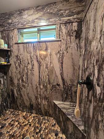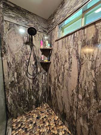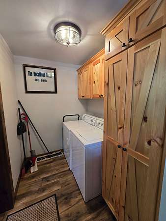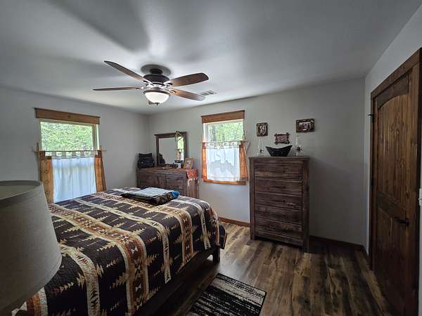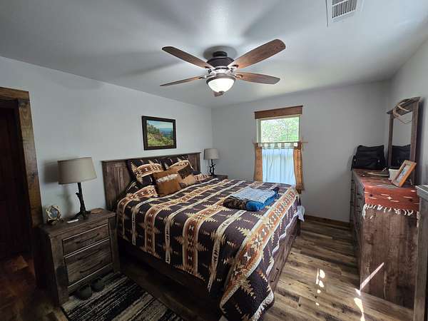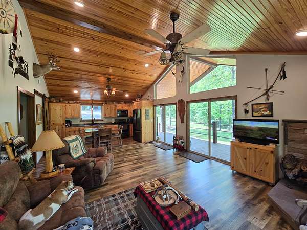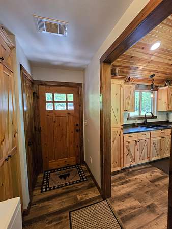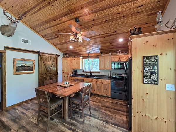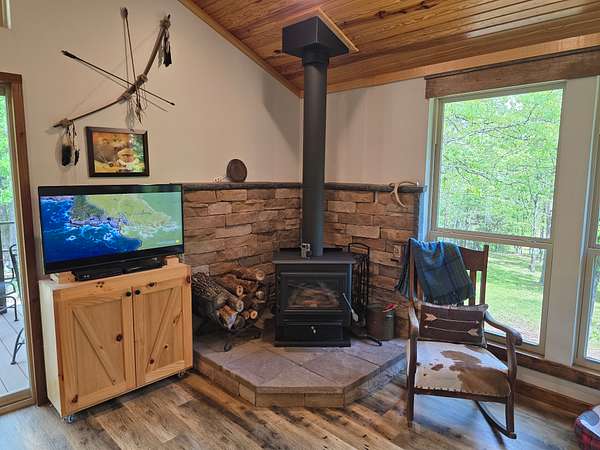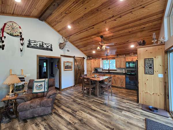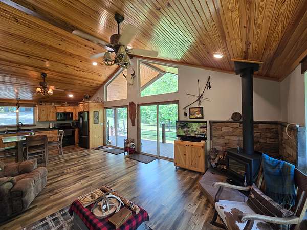 The exterior walls of the home are covered with board and batten style cedar lumber and the roof has 26 gauge metal. The inside of the home has many rustic finishes with tongue and groove knotty pine on the ceilings, custom built kitchen cabinetry and wood color pet friendly vinyl plank flooring. The home is designed to be energy efficient with double pain vinyl windows and a combination of open cell, closed cell and fiberglass insulation. The home has a 3.5 ton HVAC system and also a wood burning stove in the living room.