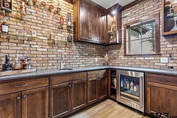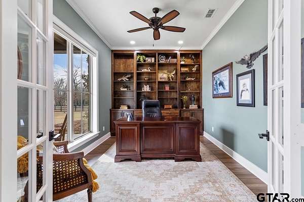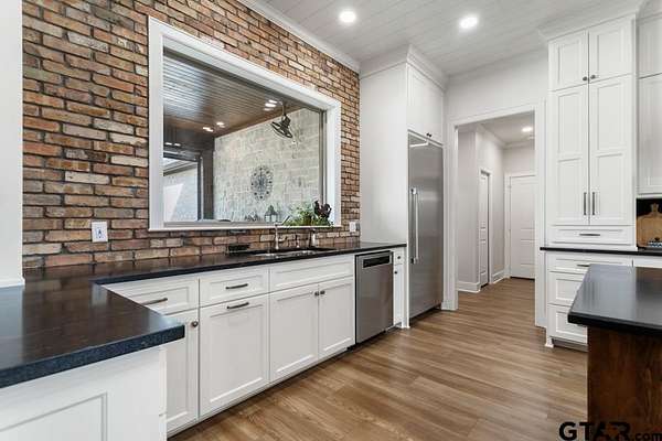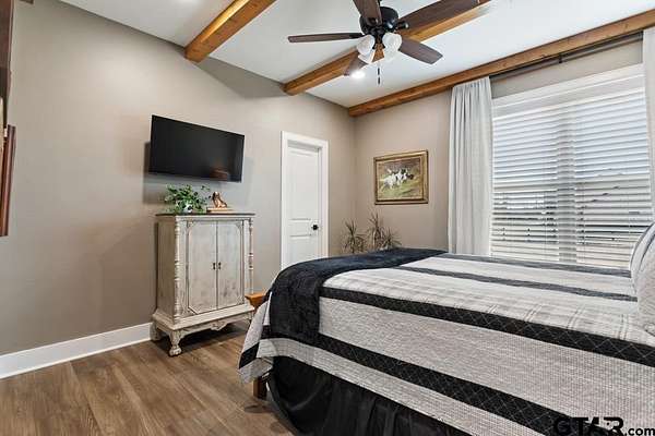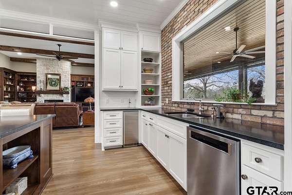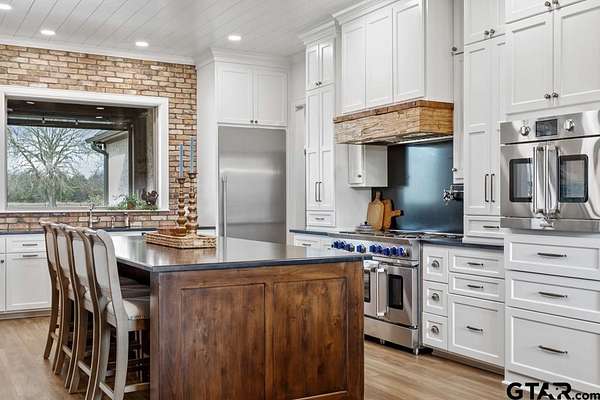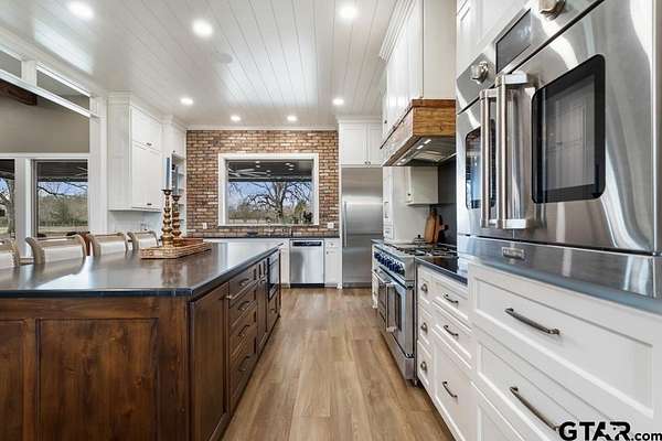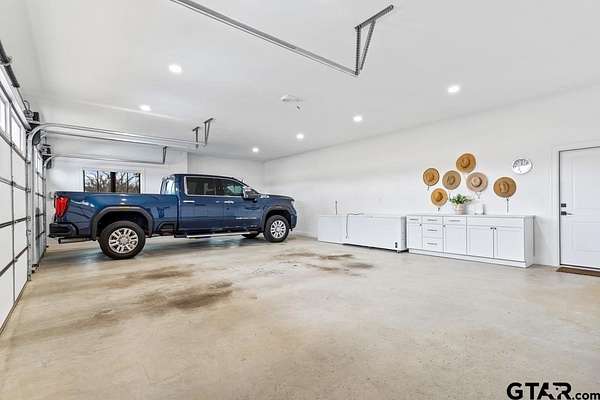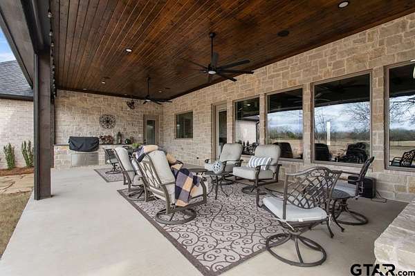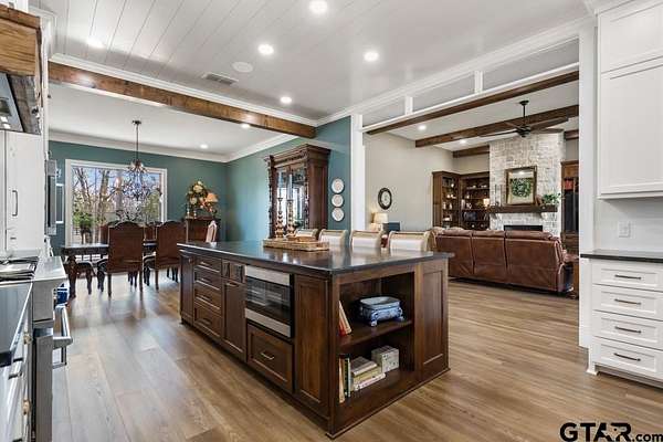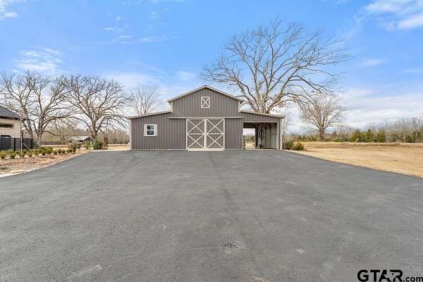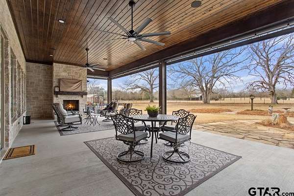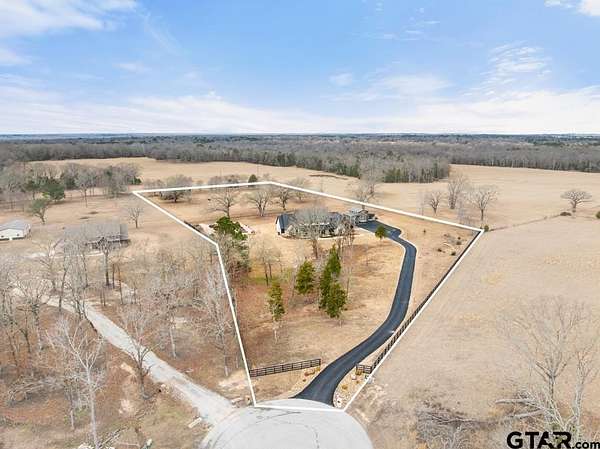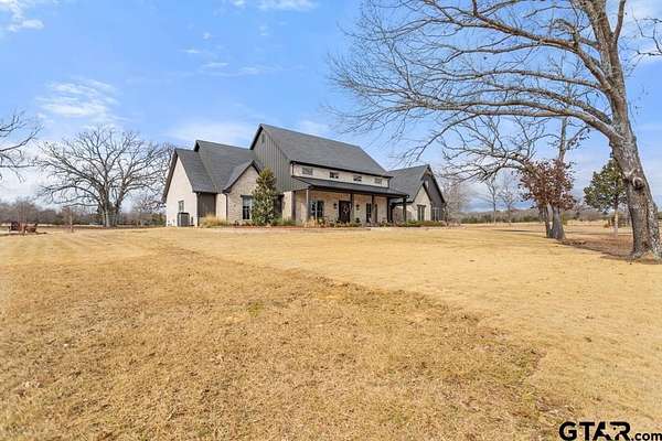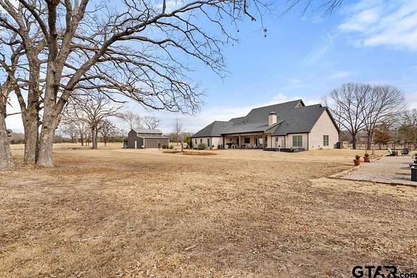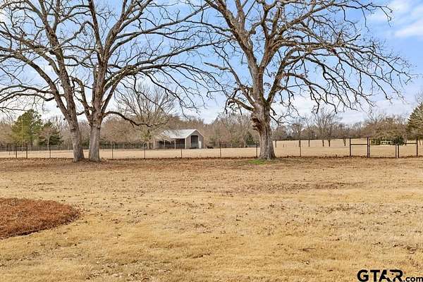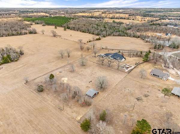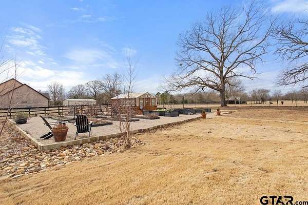 This exceptional custom-built home sits on 6 picturesque acres in East Texas within Lindale ISD, offering luxury living with thoughtful design at every turn. The spacious layout includes 4 bedrooms, 3.5 bathrooms, a dedicated office, a walk-in pantry, and a charming bonus room off the dining area ideal for a wine collection or coffee bar. Designer details shine throughout, including a floor-to-ceiling stone fireplace, exposed brick accents, and wood beams that add warmth and character. The gourmet kitchen is a true centerpiece, featuring three ovens, a 6-burner gas range, ice maker, built-in refrigerator, oversized island, and a large window framing inviting views of the property. Practical upgrades include a whole-home water filtration system, whole-home generator, EV charger, and a spacious 3-car garage. Outdoor living is just as impressive with a covered patio complete with a fireplace, TV, electric shades and built-in grill--perfect for entertaining or relaxing year-round. The property also includes a 30x40 workshop with overhead doors, a 30x40 barn in the fenced pasture, and a 10x12 greenhouse surrounded by raised, plumbed garden beds. Enjoy peaceful surroundings with convenient access to Lindale, Tyler, and the Dallas area--this property offers space, functionality, and comfort in a truly special setting.