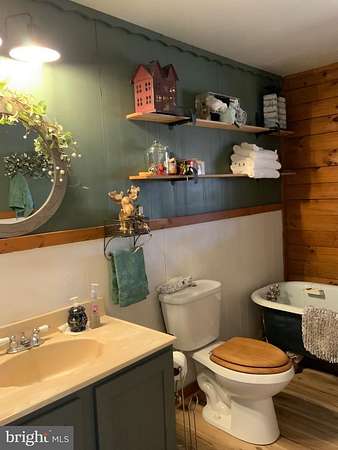 Est $1,725/moCozy cabin place in the mountains, a walk down to the Juniata River. Newer wrap around covered deck, and metal roof. The large unfinished basement is rough in for a full bathroom. Main level has new flooring throughout, living room has vaulted ceilings and large stone fireplace. Come take a look.