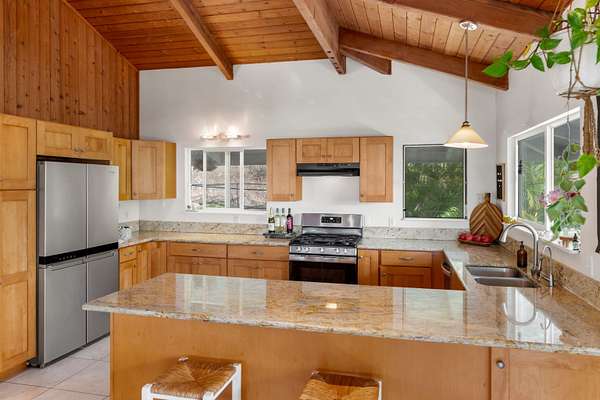 Set on just over two acres in lower Kula, 216 Keoni Place offers privacy, space, and sweeping bi-coastal views in a peaceful Upcountry setting. Tucked along Keoni Road, a quiet, tree-lined lane just off Kula Highway and shared by only seven properties, the location feels secluded while remaining conveniently close to central Maui. The main home features a flexible two-level floor plan that can function as a single-family residence or provide a semi-private lower level for guests, with more than 1,200 square feet of newly constructed deck space extending the living area outdoors. A separate cottage adds versatility with an expanded bedroom, loft space, garden bath, and its own ocean-view lanai. Currently tenant-occupied, it offers flexibility for a future owner and potential supplemental income. Both residences have high-speed internet and individual propane tanks. The property is serviced by a septic system installed in 2018, and the main home includes a reverse-osmosis kitchen filtration system and water softener. The land itself is vibrant and productive, with a mature orchard, fruiting trees, and tropical vegetation woven throughout the grounds. With its acreage, mature landscape, bi-coastal views, and peaceful setting, 216 Keoni Place offers a rare opportunity to enjoy the Upcountry Maui lifestyle while remaining close to central Maui.