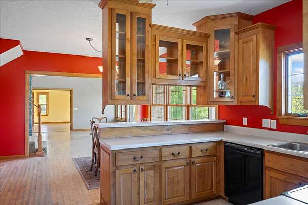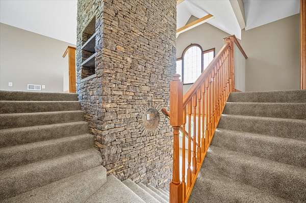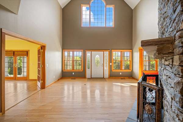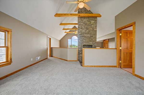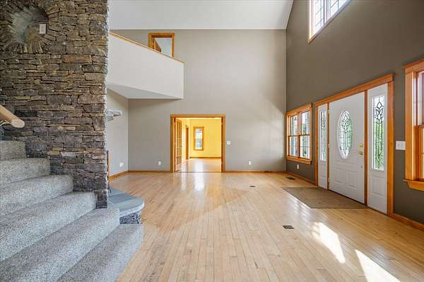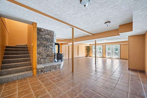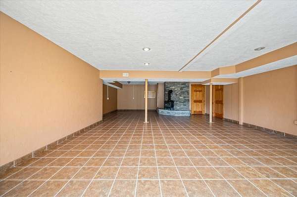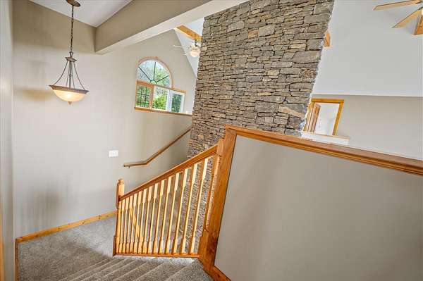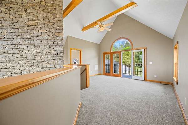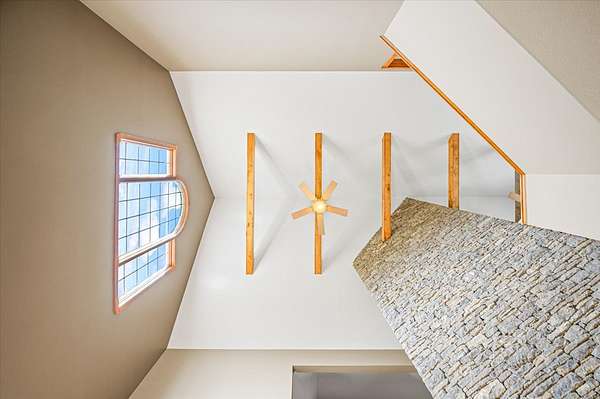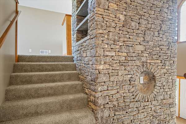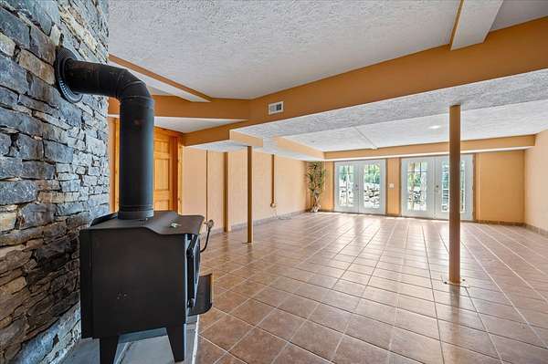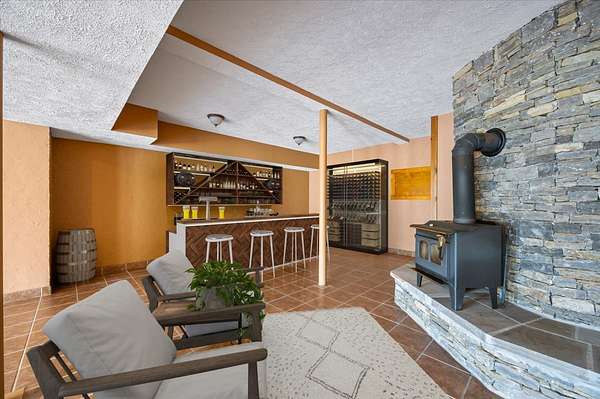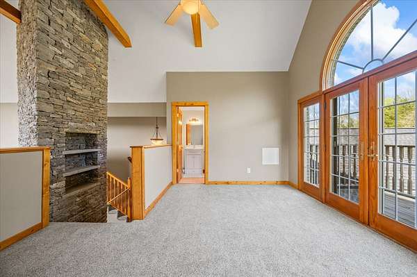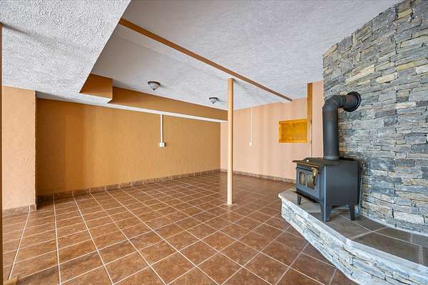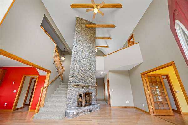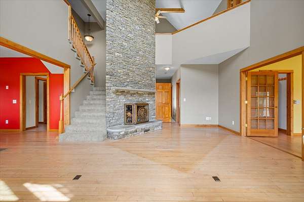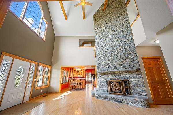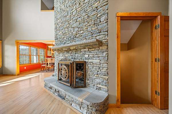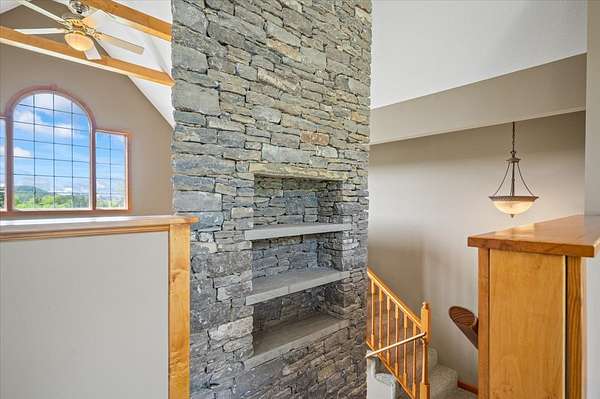 Inside, you’re welcomed by pristine maple flooring and a stunning stone fireplace that spans from the basement to the roof, creating a warm and inviting focal point. The kitchen is ready for your personal touch, while showcasing custom cabinets crafted from genuine Fender guitar wood and detailed hand-built woodwork throughout the home.
