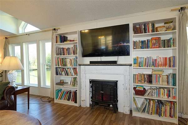 Inside, the home offers a large, open living room filled with natural light from multiple windows overlooking the pond. The layout includes a dedicated dining room, a spacious kitchen with room for an eat-in breakfast area, and decorative lighting that adds charm to both the kitchen and dining spaces. A convenient laundry area features a cozy wood-burning fireplace, adding warmth and character. All three bathrooms are full bathrooms, providing comfort and functionality for family or guests.