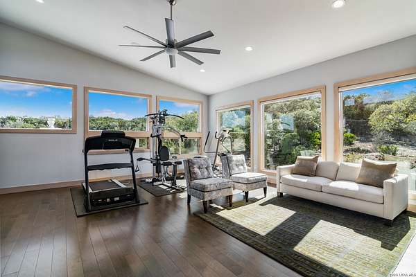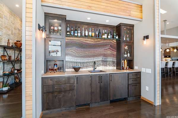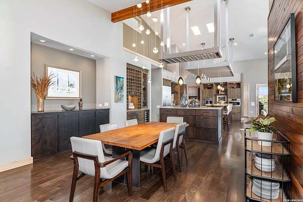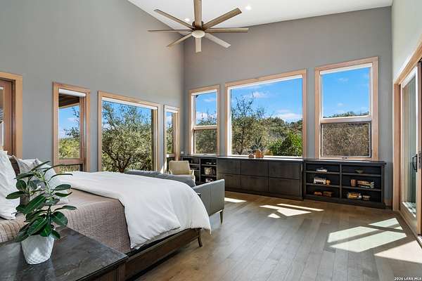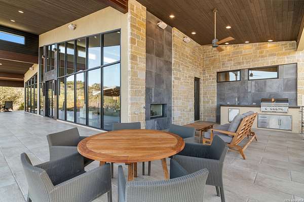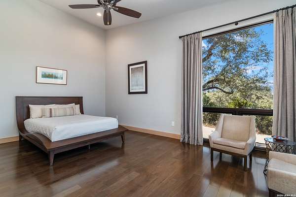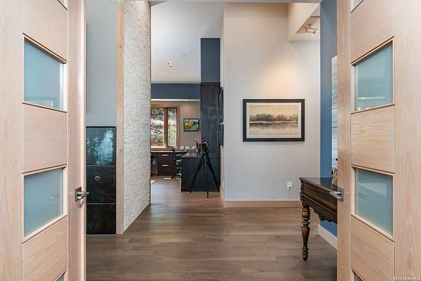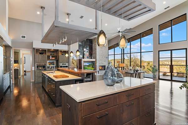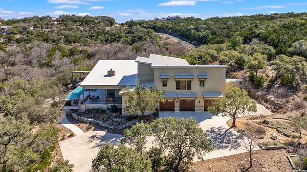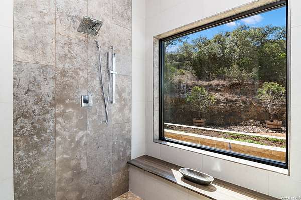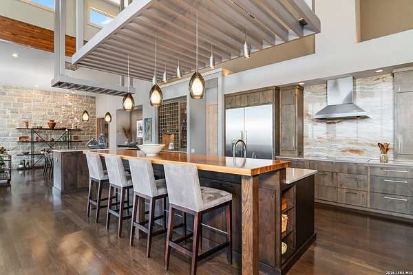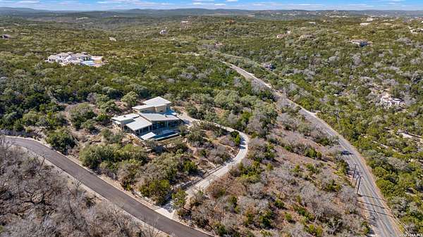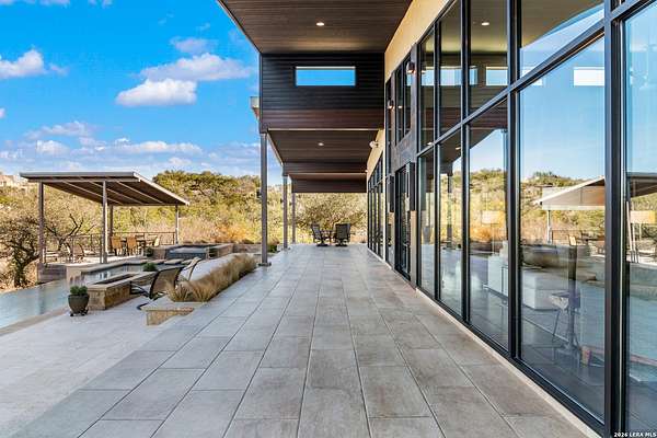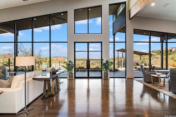 Welcome to 21604 Cielo Ridge Dr, constructed in 2015. This residence exudes a luxurious high end feel inviting you to experience sophisticated living at its finest. Elegance meets functionality with an open-concept custom built design that radiates warmth and style. A breathtaking infinity-edge pool with travertine decking and a heated pool and spa takes center stage - all perfectly positioned to capture some of the most spectacular Hill Country views in San Antonio. Expansive outdoor living wraps gracefully around the front of the home, creating a stunning first impression. The open-concept design is elevated by dramatic floor-to-ceiling windows, flooding the home with natural light and framing breathtaking views while seamlessly blending indoor and outdoor living. The gourmet kitchen is a true showpiece, featuring sleek quartz countertops, a striking quartzite backsplash, and a beautifully crafted walnut wood island with a marine-grade finish. Designed for the culinary enthusiast, it includes a steam double oven, a wine refrigerator, and a range thoughtfully plumbed for gas - blending refined design with professional-level performance. Upgrades throughout the home reflect exceptional craftsmanship and elevated design, including a reverse osmosis water filtration system, a dramatic backlit onyx backsplash, rich walnut accent walls and flooring, and solid oak interior doors that add warmth, substance, and timeless sophistication.