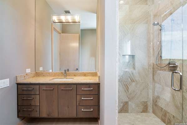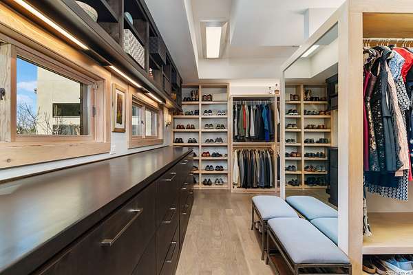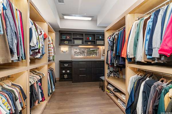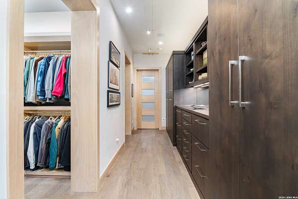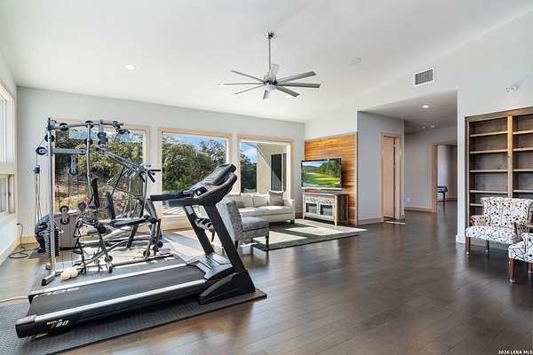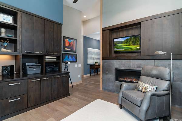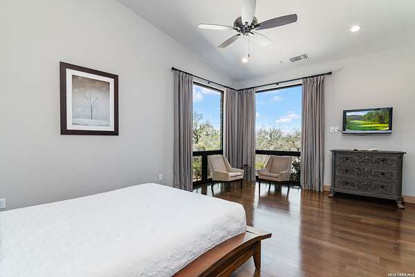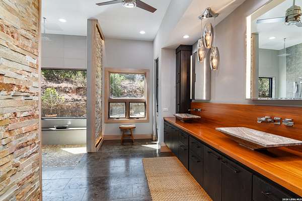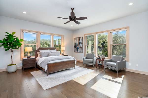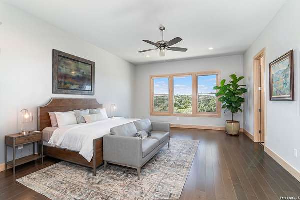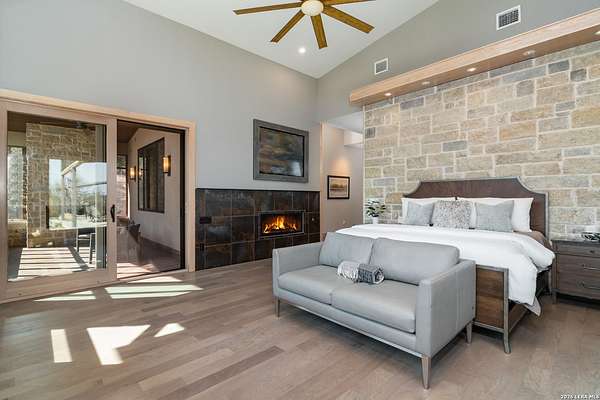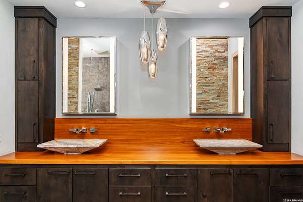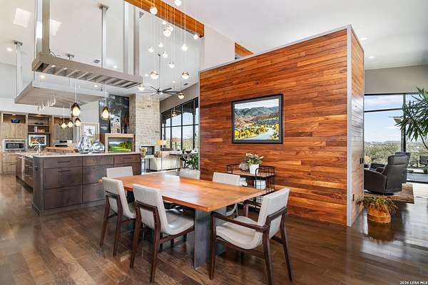 Welcome to 21604 Cielo Ridge Dr, constructed in 2015. This residence exudes a luxurious high end feel inviting you to experience sophisticated living at its finest. Elegance meets functionality with an open-concept custom built design that radiates warmth and style. A breathtaking infinity-edge pool with travertine decking and a heated pool and spa takes center stage - all perfectly positioned to capture some of the most spectacular Hill Country views in San Antonio. Expansive outdoor living wraps gracefully around the front of the home, creating a stunning first impression. The open-concept design is elevated by dramatic floor-to-ceiling windows, flooding the home with natural light and framing breathtaking views while seamlessly blending indoor and outdoor living. The gourmet kitchen is a true showpiece, featuring sleek quartz countertops, a striking quartzite backsplash, and a beautifully crafted walnut wood island with a marine-grade finish. Designed for the culinary enthusiast, it includes a steam double oven, a wine refrigerator, and a range thoughtfully plumbed for gas - blending refined design with professional-level performance. Upgrades throughout the home reflect exceptional craftsmanship and elevated design, including a reverse osmosis water filtration system, a dramatic backlit onyx backsplash, rich walnut accent walls and flooring, and solid oak interior doors that add warmth, substance, and timeless sophistication.