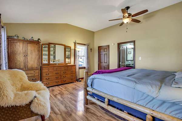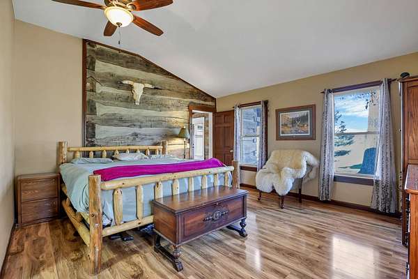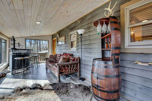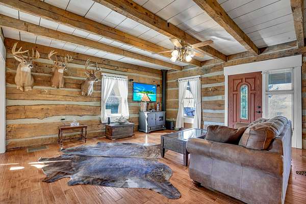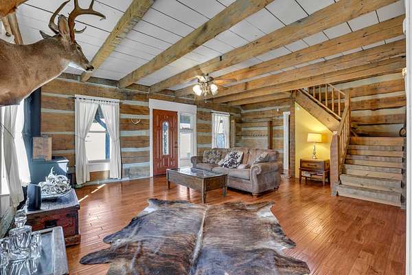 Large rustic living room with exposed logs and beautiful hardwood floors
