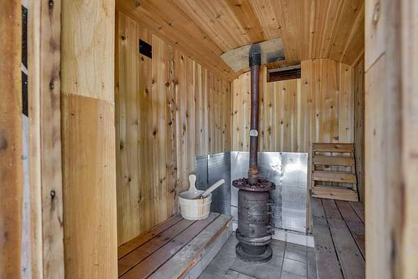 Additional buildings include a 1-car garage, chicken coop, garden shed, and sauna