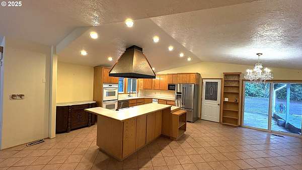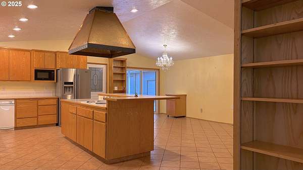 - Cooktop, Dishwasher, Double Oven, Free Standing Refrigerator, Instant Hot Water, Island, Microwave, Plumbed For Ice Maker, Solid Surface Countertop, Stainless Steel Appliance