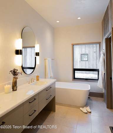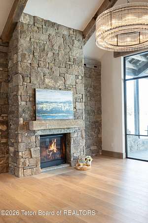 Set on a 2.43-acre Estate lot in 3 Creek Ranch, Mirror Pond offers beautiful views of the Tetons & a sense of space. This architectural masterpiece fuses old-world charm with modern luxury. Designed by Tyler Call of Annex Architecture & built by Lohss Construction, the estate exudes quality & sophistication. Featuring 6,982 sf with 5 ensuite bedrooms, highlights include: 2 covered patios, exquisite finishes, appliances & fixtures, oversized garage parking for 3 cars & up to 2 golf carts & lovely landscaping with a pond. Residents enjoy privileged access to pristine fly-fishing and to the Nature Center's myriad outdoor pursuits. Members enjoy fine dining and clubhouse amenities including the 75-foot heated pool, gym, & tennis courts. Located just 15 minutes from the Town Square.