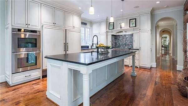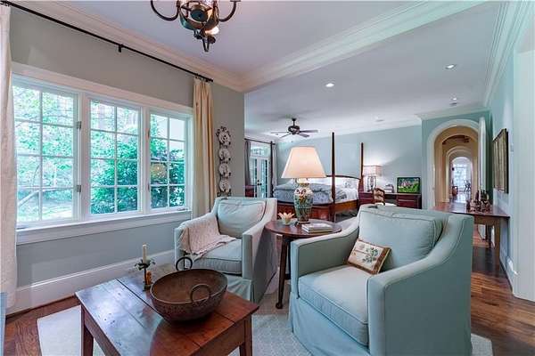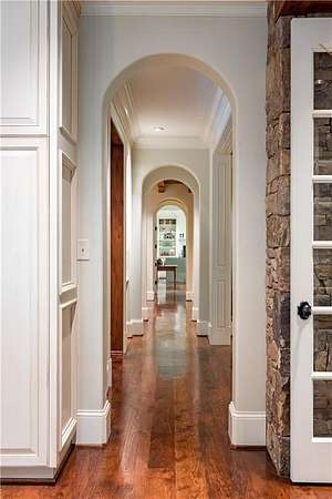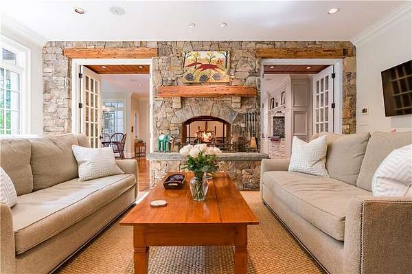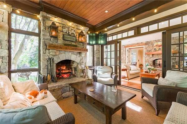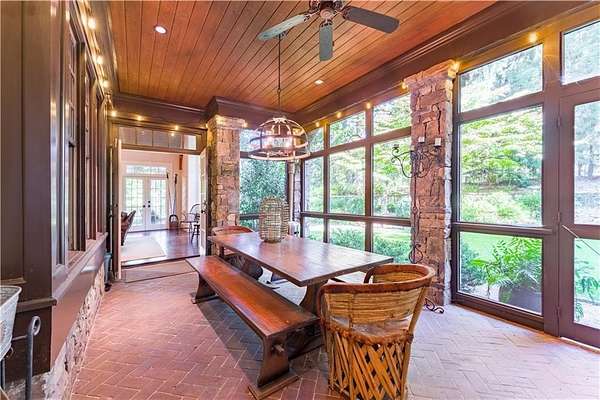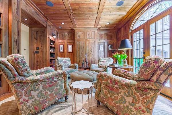 The show-stopping great room features a dramatic vaulted wood ceiling and one of 5 fireplaces! Access dining, kitchen, keeping room, screened porch & primary bedroom along a long hallway lined with graceful arches.
