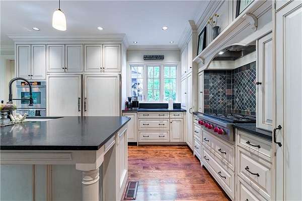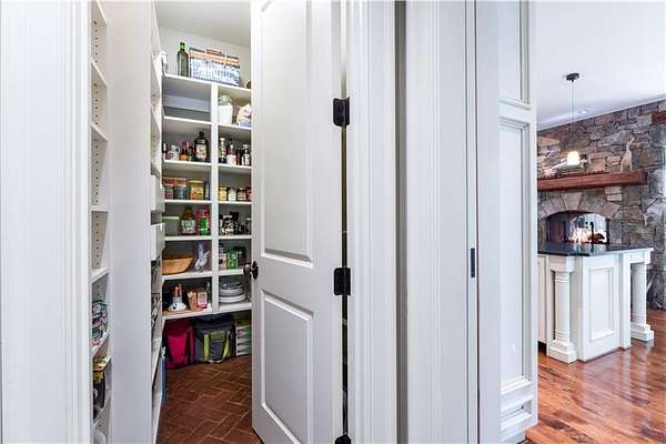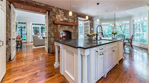 The lovely light-filled kitchen is full of character and charm with custom white cabinets, matte black stone counters, massive island, generous walk-in pantry, and a light-drenched breakfast area. A really beautiful stone 2-sided fireplace has a Scandanavian brick firebox for excellent heat distribution in the kitchen and keeping room.