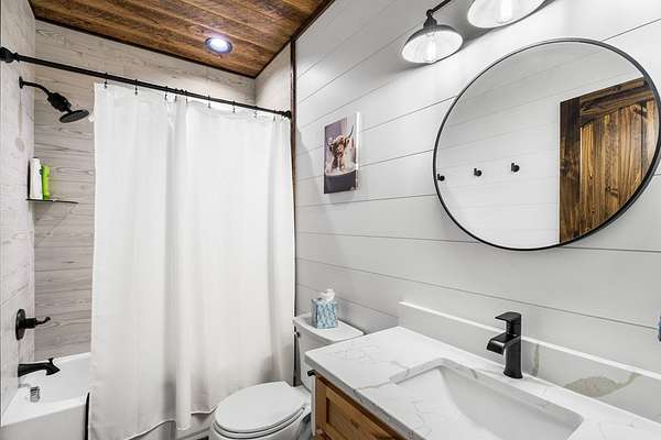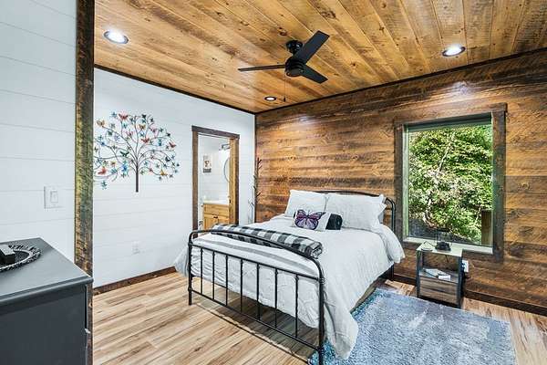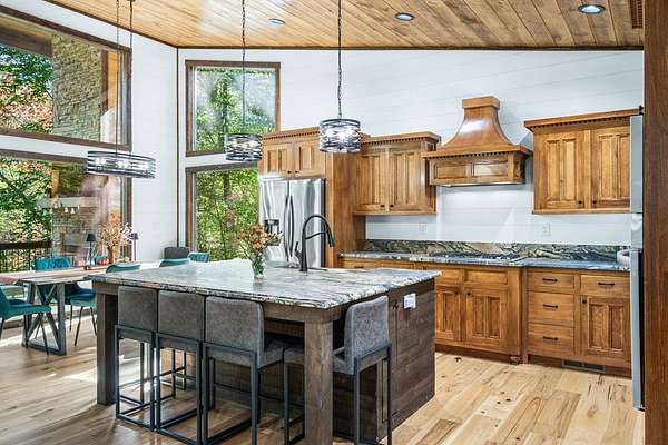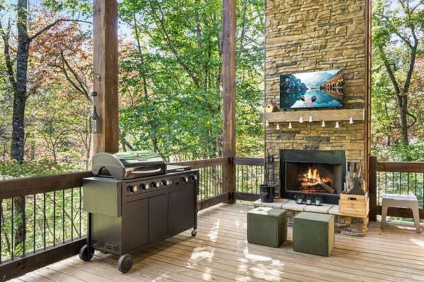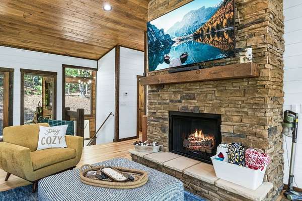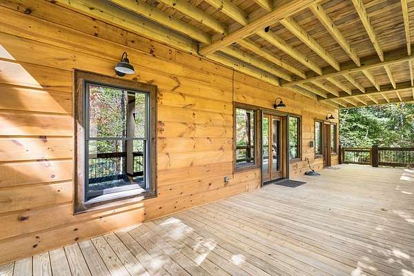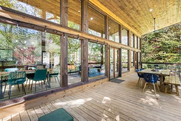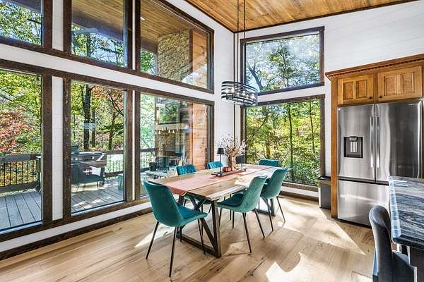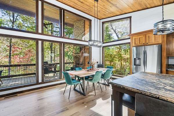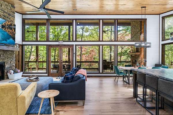 This stunning 2023-built Mountain Modern retreat seamlessly blends refined contemporary design with the warmth and charm of the Appalachian lifestyle. Privately nestled on 3.15 acres with a long, secluded driveway and a year-round running creek, this property offers peace, privacy, and a true connection to nature—just minutes from downtown Blue Ridge. Since completion, the home has been thoughtfully enhanced with high-end upgrades, including a custom-built carport with attached storage, leathered granite countertops, a custom kitchen island, WiFi-enabled appliances, Mirage retractable screens on sliding doors, and Hunter Douglas window treatments throughout—creating a truly turnkey, luxury experience. Inside, the bright open-concept layout features soaring wood ceilings, a striking stone fireplace, and a dramatic wall of windows that brings the outdoors in. The main-level primary suite offers a spacious retreat with a beautifully designed ensuite bath and modern finishes. The terrace level mirrors the quality of the main floor with a second stone fireplace, a wet bar, two generously sized bedrooms—each with private baths—and a large covered porch ready for a future hot tub. Designed for both relaxation and entertaining, the expansive covered main-level porch is a true showpiece—complete with an outdoor stone fireplace, mounted TV, and peaceful wooded and creek views. Whether hosting or unwinding, this space captures the essence of mountain living. Offered fully furnished, decorated, and turnkey, this property is ideal as a full-time residence, luxury getaway, or investment opportunity. With multiple short-term rental projections estimating $68,000+ in annual income to start, this home offers both an exceptional lifestyle and strong income potential.