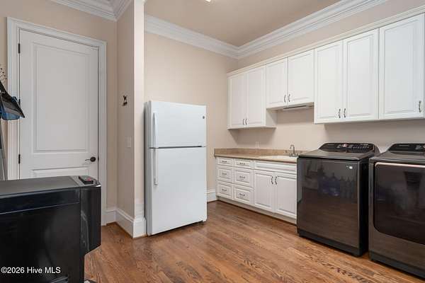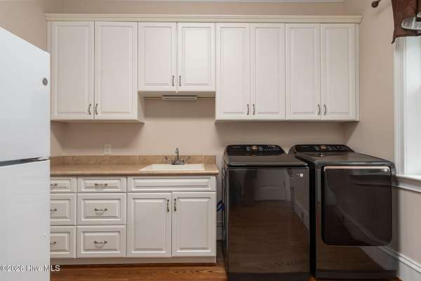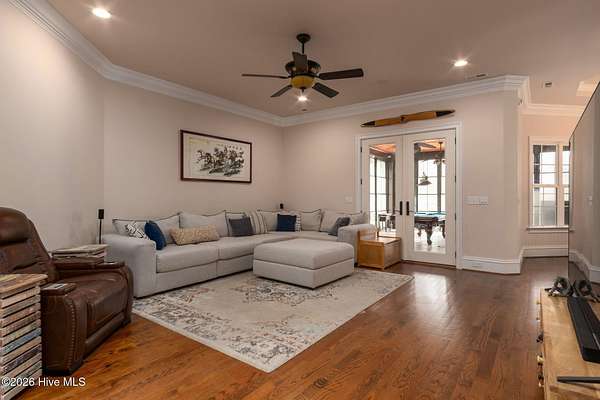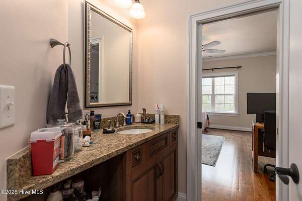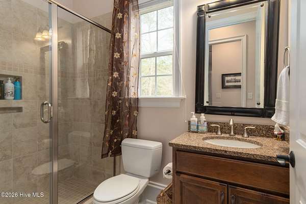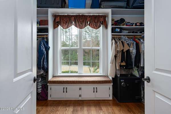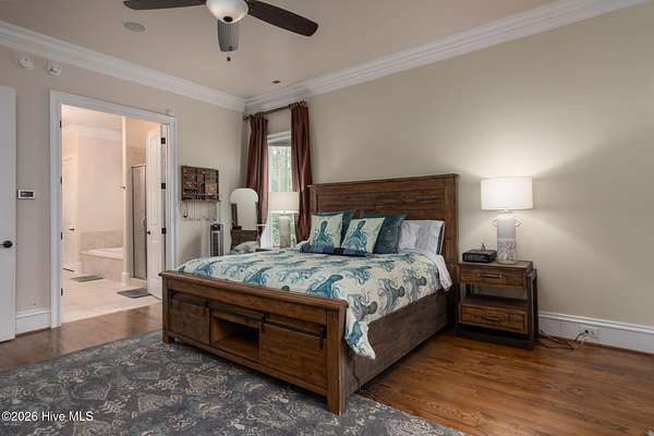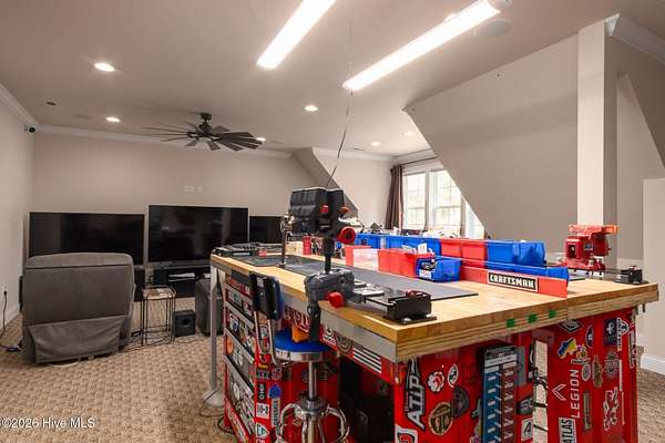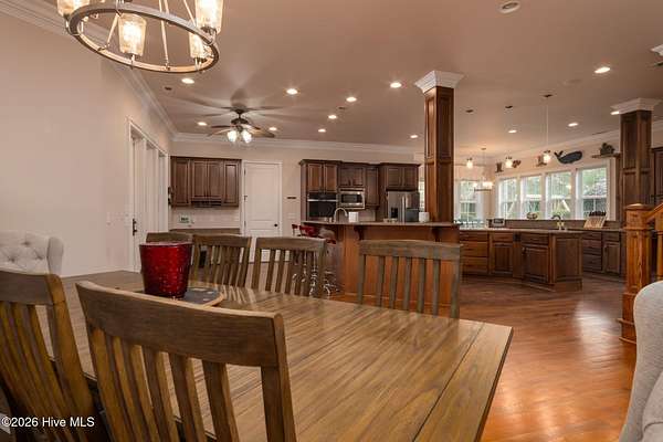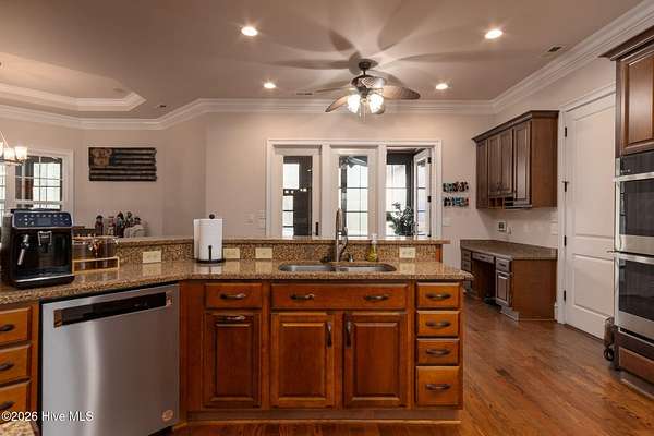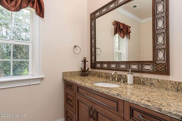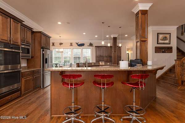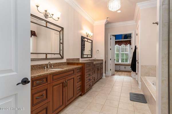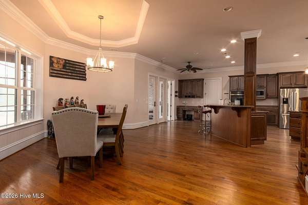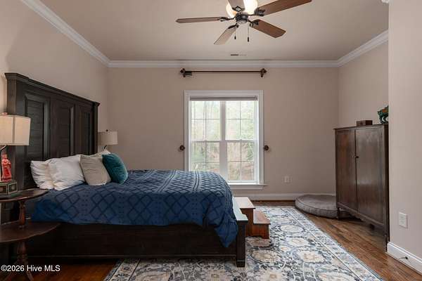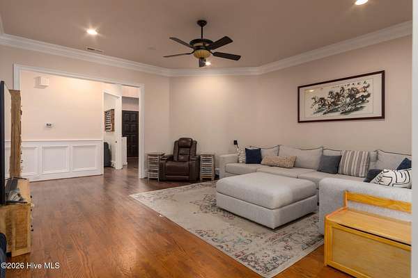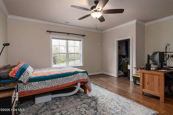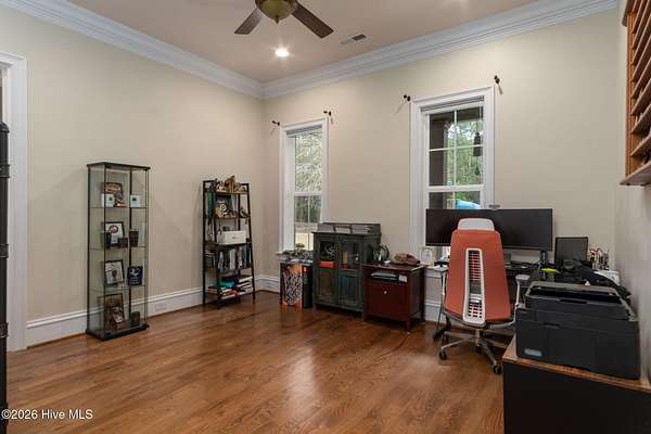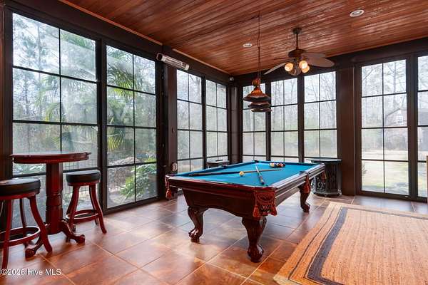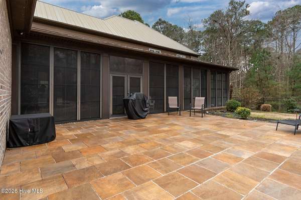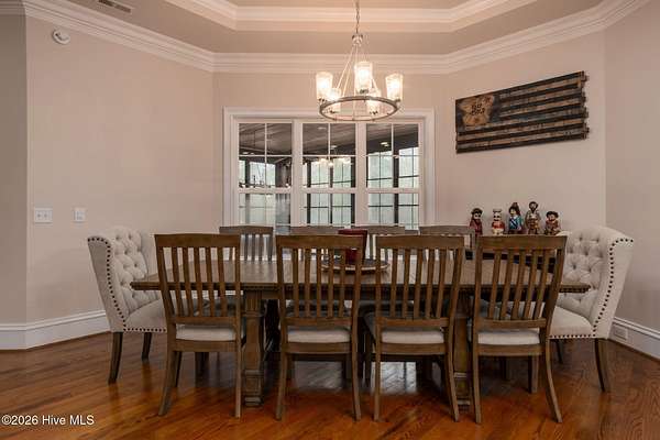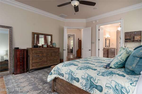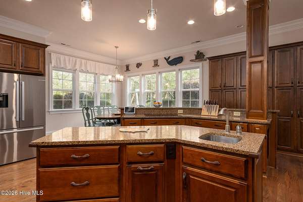 Welcome to this private 5-acre estate in Swansboro offering 5,136 square feet of refined living, privacy, and space to truly spread out. A grand foyer sets the tone with a sweeping wrap-around staircase, soaring 12-foot ceilings, and rich Red Oak hardwood floors. Extensive crown molding and custom finishes showcase quality craftsmanship throughout. The main-level primary suite serves as a true retreat with direct access to a wrap-around sunroom featuring cedar ceilings and peaceful backyard views. The spa-inspired bath includes a tiled walk-in shower, soaking tub, dual granite vanities, and an oversized walk-in closet. Designed for entertaining, the open living and dining areas flow seamlessly into the gourmet kitchen complete with granite countertops, dual islands, soft-closing cabinetry, walk-in pantry, breakfast nook, and newly installed stainless appliances. Upstairs offers four spacious bedrooms, two full baths with granite countertops and tiled surrounds, plus a large bonus room with full bath ideal for a media room, fitness space, or guest retreat. Additional highlights include a private office, oversized laundry room with sink and storage, a three-car garage with attic access and electric vehicle charger, and a detached two-story workshop offering flexible space for hobbies or a studio. Enjoy your own backyard retreat with an in-ground saltwater pool and expansive green space. A durable metal roof, two recently replaced HVAC systems, and a 48 KW whole-home Kohler generator provide long-term value and peace of mind. An exceptional estate offering scale, comfort, and modern reliability just minutes from the coast.
