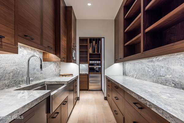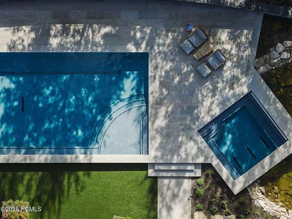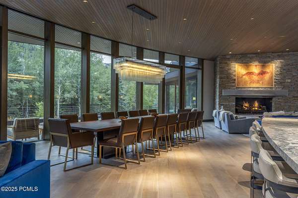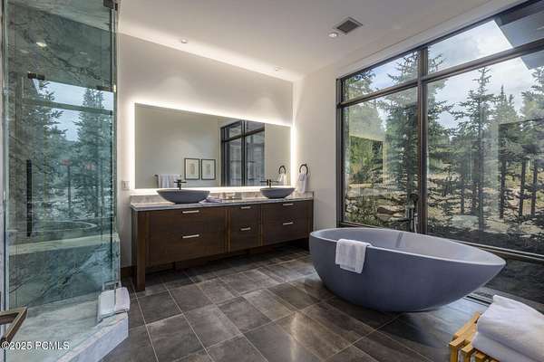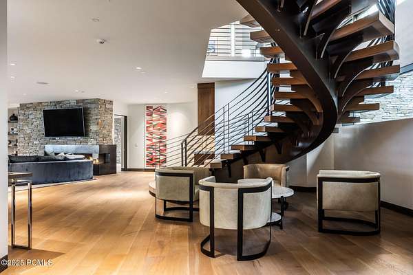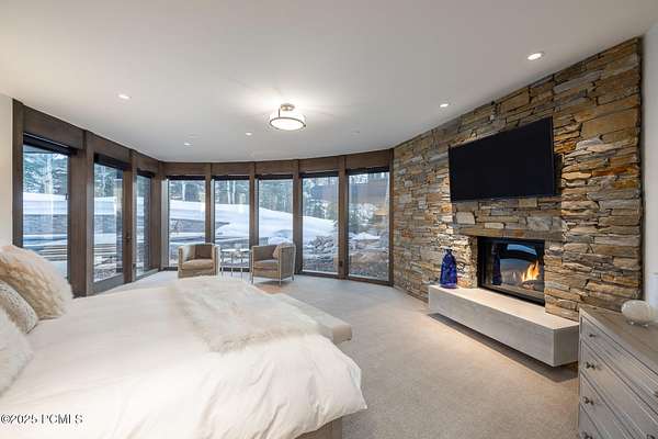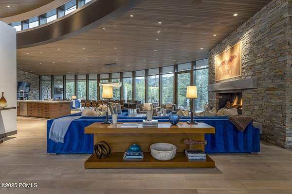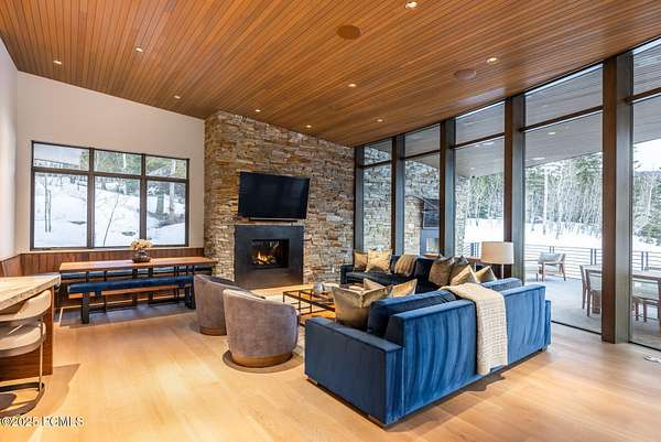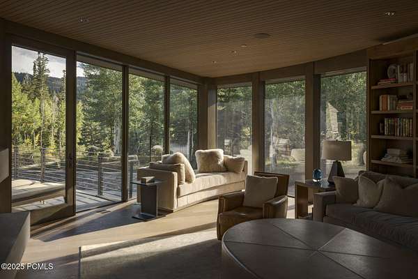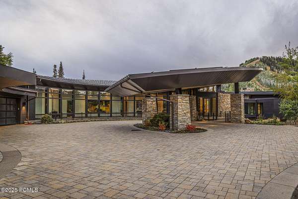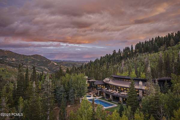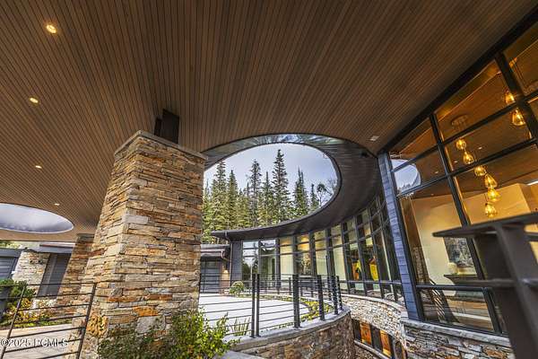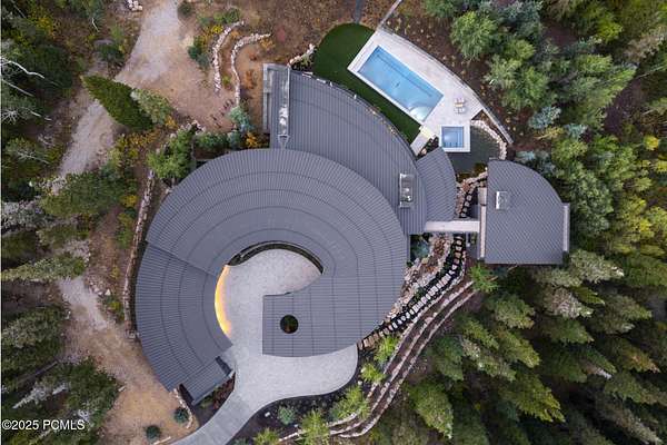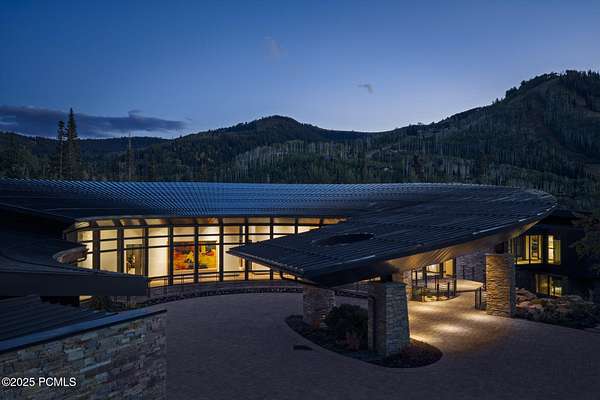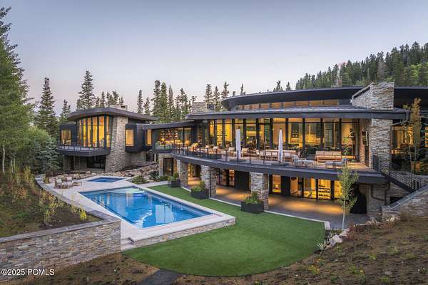 Welcome to Soluna at The Colony-a true architectural landmark envisioned by Michael Upwall and brought to life on one of the most coveted 4.5-acre ski in ski out lots in Park City. With its signature curved silhouette and window-lined bridge entry, the home feels less like a structure and more like a living sculpture, thoughtfully designed to follow the natural topography of the land. Every angle, every room, every moment has purpose, flowing intuitively from private sanctuaries to vibrant gathering spaces. Soaring glass walls frame snow-covered peaks and sun-drenched ridgelines, while the cascading creek just beyond the heated deck provides a serene soundtrack to daily life. From the spa-like primary wing to the entertainer's dream kitchen, home theater, gym, and radiant outdoor terraces & drive, four season pool & spa, the design invites you to move, breathe, and connect with the mountains in every season. The Private Parcel also allows you to gather with friends and family in a surreal serenity. The tree filled parcel also allows for a guest house already intuitively designed by Upwall Design.