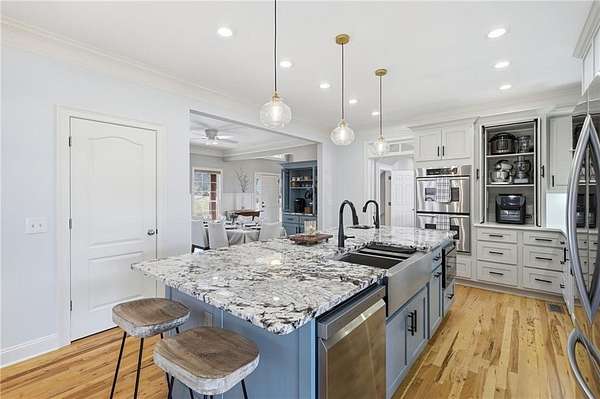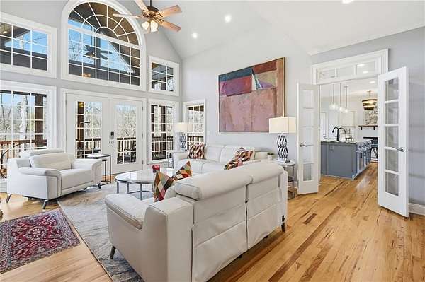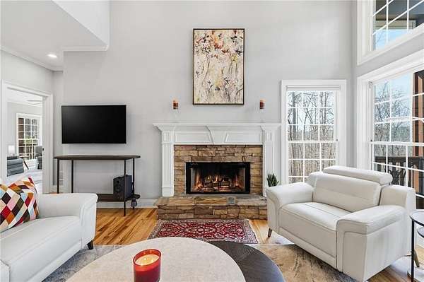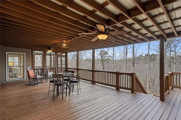 5 BR/3.5BA on 3.4507 wooded acres, just minutes from downtown Ball Ground with convenient access to Interstate 575. A gated entry and fully fenced grounds offer privacy and a welcoming sense of arrival. Hardwood floors throughout and fresh interior paint enhance the home's move-in-ready appeal. Recent improvements include a remodeled Chef-Inspired kitchen with a walk-in pantry, a basement dehumidifier, and a newer roof (approximately 2 years old). The main level features a primary suite with a gas fireplace (gas logs) and separate porch entry, along with a mudroom/laundry room. Upstairs are two additional bedrooms, one full bathroom, and ample storage. Multiple decks on multiple levels extend the living space outdoors. The finished basement includes two bedrooms, one full bath, three bonus rooms, and generous storage, offering flexibility for guests, recreation, office space, or multi-generational needs. A detached garage includes an upstairs heated/cooled bonus room. Outdoor features include a backup generator, well water supply, and a propane tank. An additional 3.6765-acre lot is available separately for $150,000. The neighborhood is set above Flatbottom Road, so it is insulated on the ridge. Ball Ground is a growing community. It has a quaint downtown and friendly shops and cafes are opening every week. Robert's Lake Trail is located just north of downtown and Gibbs Gardens are nearby. There are wonderful schools and community events to enjoy.