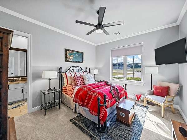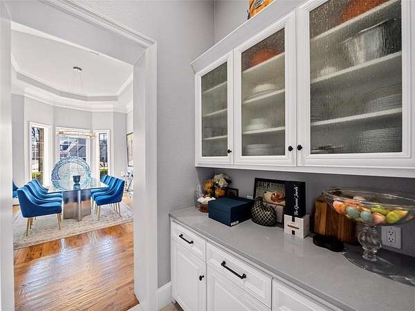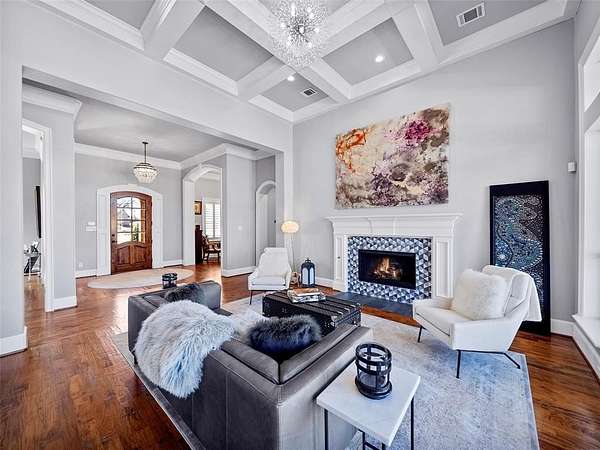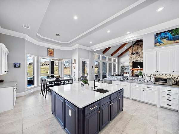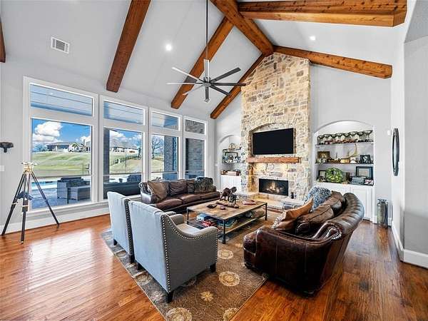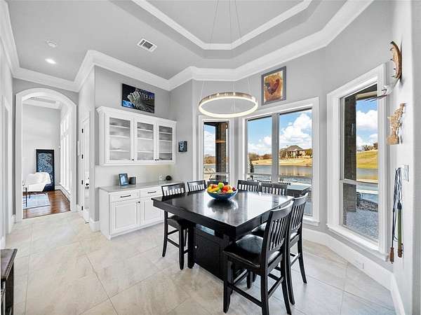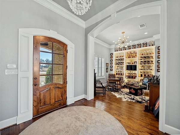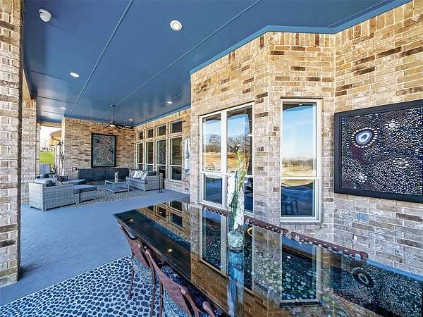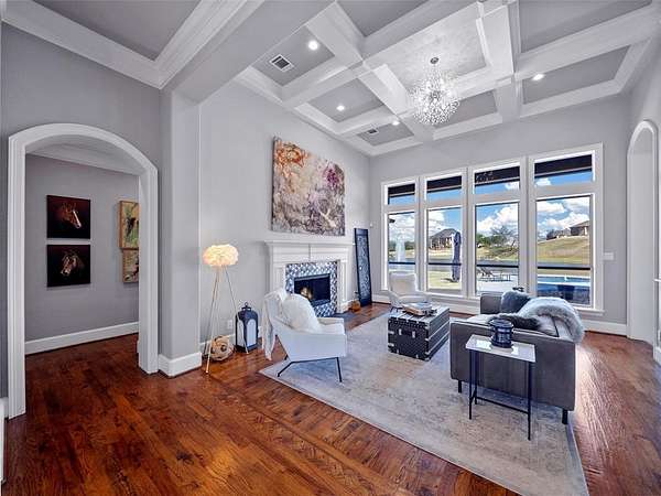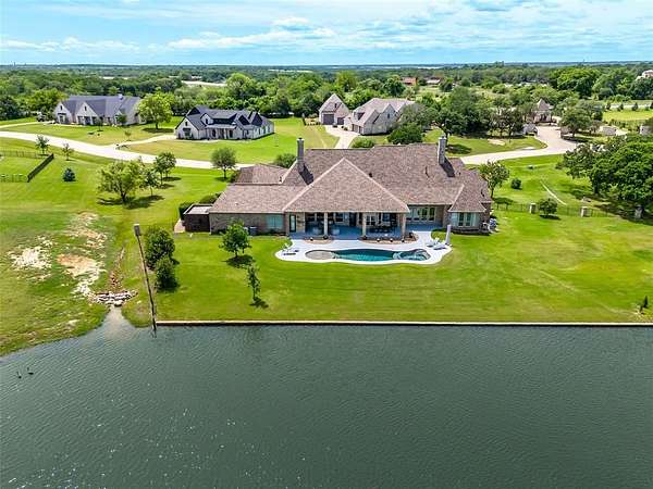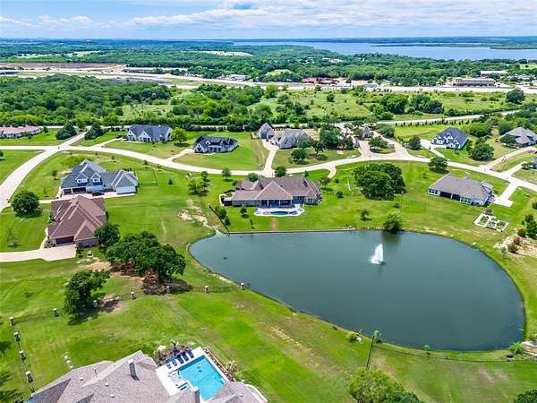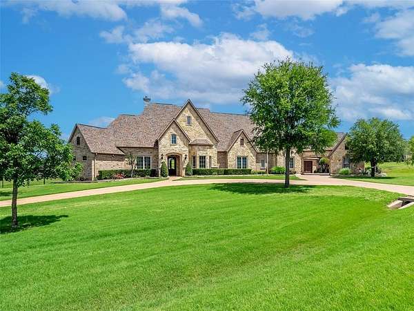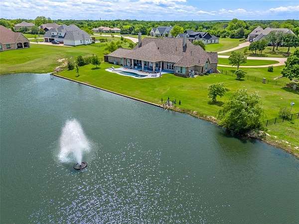 In the coveted gated community of Forest Hills in Cross Roads, discover this meticulously renovated masterpiece with easy access to Highway 380 in booming North Texas. Set on 2.32 serene acres, stunning sunsets and a picturesque pond with an illuminated fountain create magical evenings. The single-story design offers 4,250 square feet of interior living space. Step inside to soaring 10,12, and 14-foot ceilings throughout, crowned by a breathtaking 20-foot cathedral ceiling in the family room and sophisticated coffered details in the formal living area. The flowing floor plan seamlessly connects the formal dining room to the elegant living space, with stunning fireplaces gracing the formal living and family rooms. An expansive master suite offers luxurious privacy with an oversized bathroom and walk-in closet. The heart of this home is a spacious chef's kitchen that opens to a light-filled family room, creating the perfect space for both entertaining and daily living. Distinctive 9-foot solid doors throughout add to the home's architectural appeal, while recent updates include new HVAC systems installed in 2023 and 2024. The entire residence has been freshly painted inside and out with premium paint. Step outside to find your private oasis - a completely renovated pool & expansive entertainment area featuring over 2,000 square feet of patio and deck space. The pool has cutting-edge features, including an efficient chiller system to maintain perfect temperatures during hot months and an automatic water leveling system. The property's efficient irrigation system draws from a private pond owned by 6 homeowners, significantly reducing water costs. Both climate-controlled garages feature extensive above-storage space with dedicated lighting, providing ample room for organization. Modern stone accents & a sophisticated color palette complete this thoughtfully updated residence, creating a perfect blend of luxury & comfort in one of North Texas's most desirable locations.