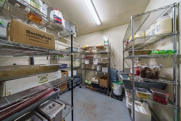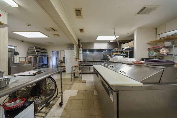 The commercial kitchen is well equipped and thoughtfully laid out for efficiency, featuring three fryers, a large griddle with refrigerated drawers, convection oven with warmers, two freezers, prep station, steam warmers, warming box, can rack, large commercial wash sink, and a walk-in cooler. All equipment is conveniently arranged, making it easy for a new owner to step in and continue operations. All equipment, supplies, tables, chairs, and everything inside building will convey to new owners.