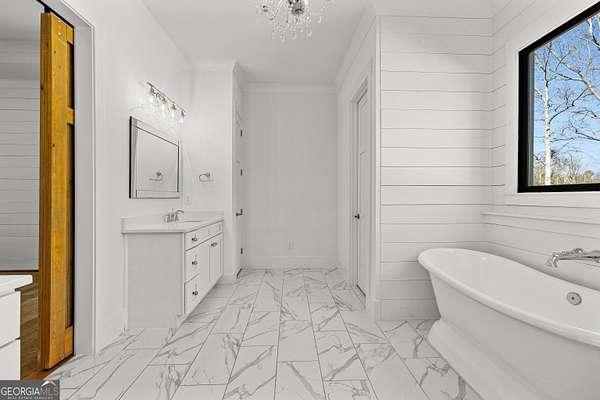 - Beamed Ceilings, Double Vanity, High Ceilings, Master On Main Level, Rear Stairs, Separate Shower, Soaking Tub, Split Bedroom Plan, Tile Bath, Walk-In Closet(s)