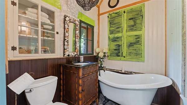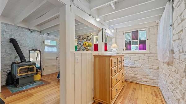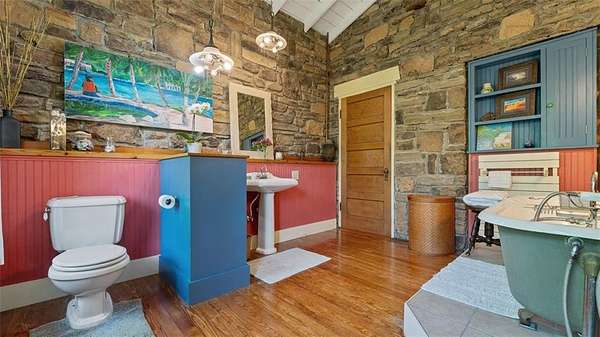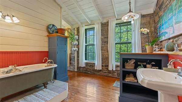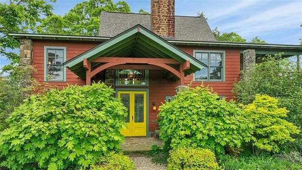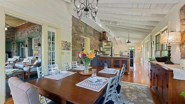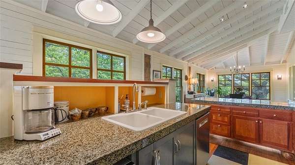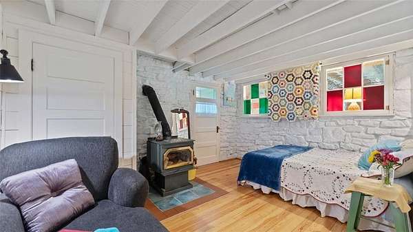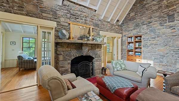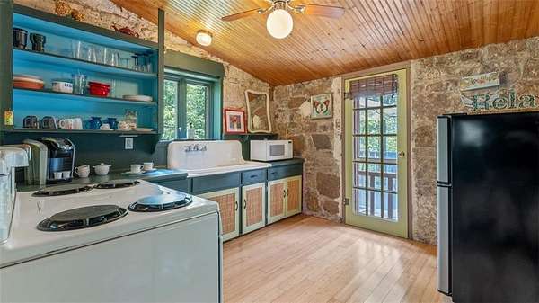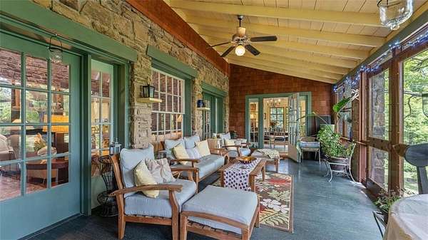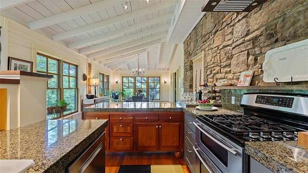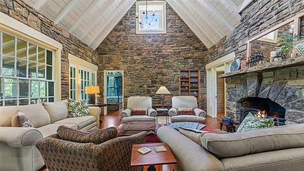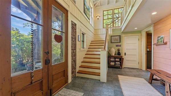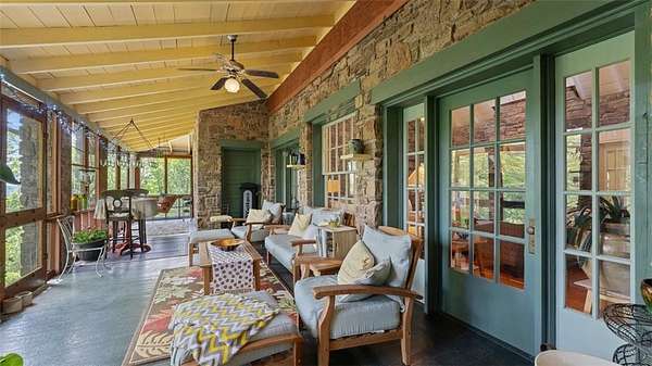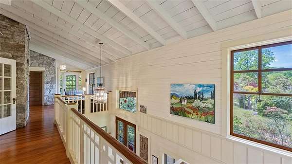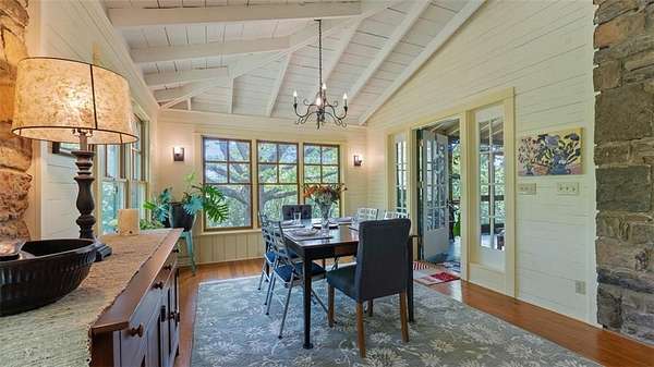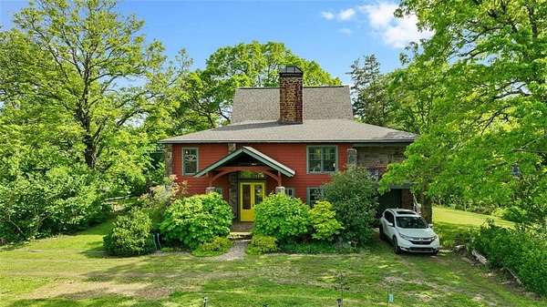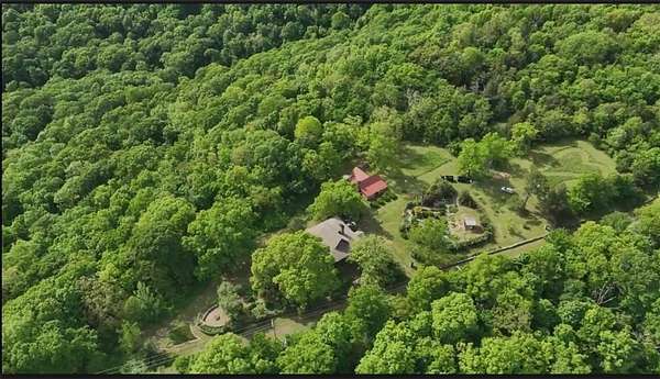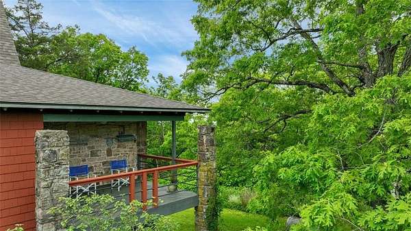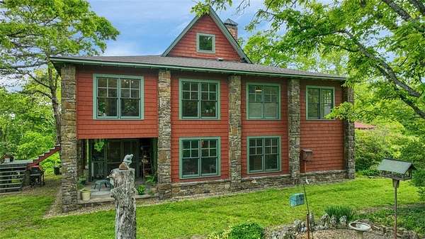 The main home showcases native stonework, high ceilings, and expansive windows inviting the outdoors in. A unique "treetop" floor plan, with kitchen & living areas on the upper level, enhances the connection to nature. The native rock guest cottage includes its own kitchen, enclosed porch with Jacuzzi & sunset deck; perfect for guests, multi-generational living, or rental income. The property features terraced gardens, lily pond, stone patio, & fenced garden with cedar gazebo. Ideal for gardeners, hunters, & nature lovers.