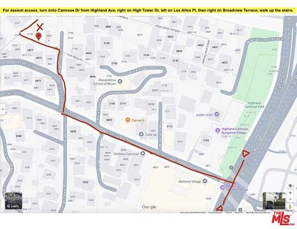 From 101 Freeway, exit Highland Ave. Go South. Turn Right onto Camrose Dr. Turn Right onto High Tower Dr. Walk up Los Altos Pl to 2172 Broadview Terrace.