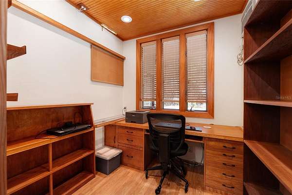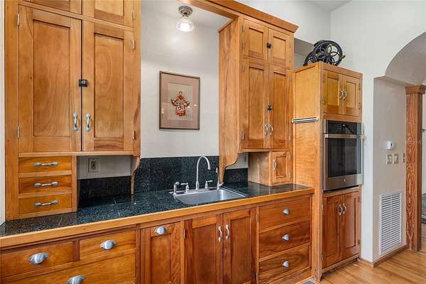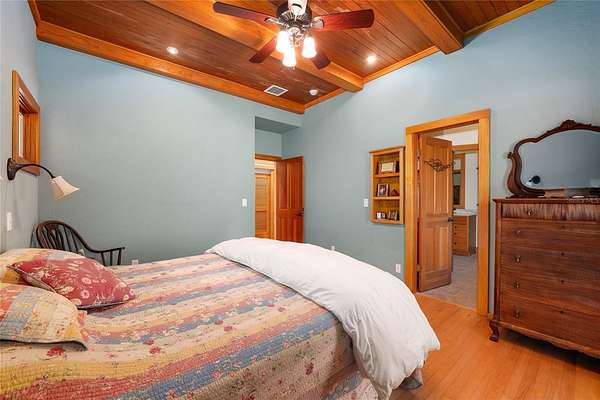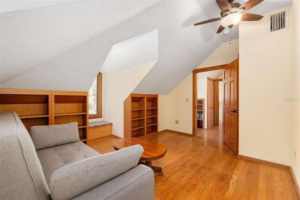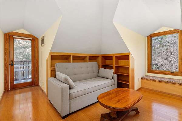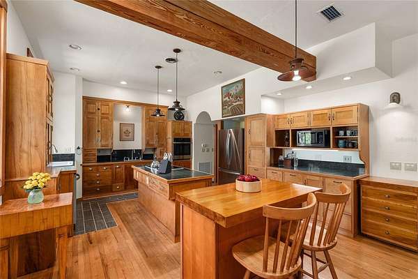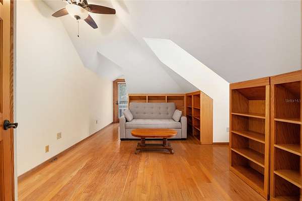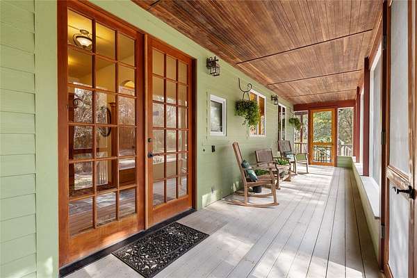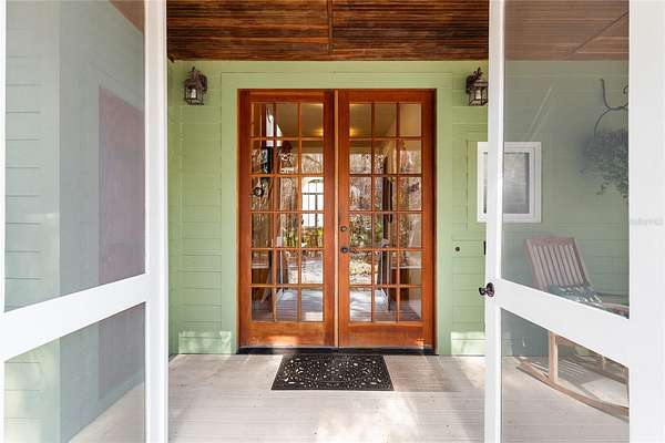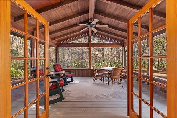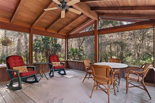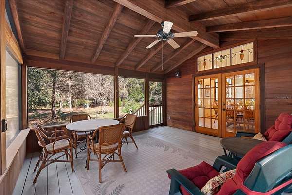 Built in 2002, the all Hardi-Board exterior is complemented by screened porches on every side of the home, creating seamless indoor-outdoor living. An expansive covered front screen porch leads to the welcoming foyer, where original oak hardwood floors continue through the kitchen, downstairs hallway, and primary suite. To the left of the foyer, the grand great room impresses with a vaulted ceiling, wood-burning stove fireplace, abundant natural light, and built-in bookshelves flanking both sides of a cozy window seat. The kitchen truly serves as the heart of the home and showcases the Craftsman style, featuring repurposed vintage wood cabinetry, granite countertops, a center island with smooth cooktop, stainless steel appliances including a newer refrigerator and dishwasher, prep sink, reverse osmosis system, and exceptional storage throughout. Adjacent to the kitchen is a spacious dining area with a bay window and french doors topped with a stained-glass transom, opening to the main screened porch overlooking the yard and a picturesque pond. A long hallway with floor-to-ceiling storage closets leads to the primary suite, highlighted by a tongue-and-groove ceiling and its own private screened porch. The en-suite bath includes dual sinks with marble counter, a private water closet with bidet, a large shower, and a jetted soaking tub. Across the hall is a flexible guest bedroom ideal for an office, exercise room, or studio space. The first floor is completed by a half bath, small office, laundry room with washer and dryer, a generous A/C mudroom/potting room with sink and private entrance to the yard, and great storage in the spacious under-stair closet. Upstairs offers a large bonus or family room, three charming bedrooms--each with window seats--a full bath with large shower, and a cozy reading nook. One guest bedroom opens to a private balcony. This one-of-a-kind property has been thoughtfully updated, including a new roof (2025), water heater (2024), water softener (2025), and new gutters. The grounds feature open cleared areas with landscaping beds including blueberry bushes and pear trees. No HOA, with service from Duke Energy and Spectrum high-speed internet. Located a short drive to historic Micanopy and 20 minutes from Gainesville and Shands Hospital, this special retreat offers the best of peaceful country living. Whether rocking on the front porch beneath granddaddy live oaks or unwinding on the back screened porch overlooking the pond, you are fully immersed in the timeless beauty of "Old Florida."