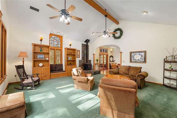 - Built-In Features, Cathedral Ceiling(s), Ceiling Fans(s), Eat-In Kitchen, High Ceilings, Open Floorplan, Primary Bedroom Main Floor, Solid Wood Cabinets, Stone Counters, Walk-In Closet(s), Window Treatments
