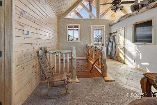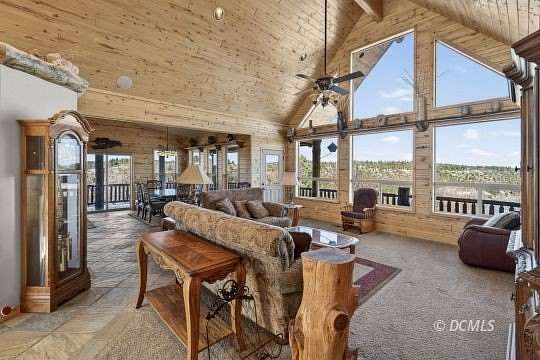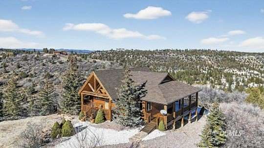 Perched on a hilltop with 10.66 acres, this 2,721 SF home offers the perfect blend of privacy & breathtaking views. This home captures the essence of mountain living with modern reliability & superior craftsmanship. The spectacular Great Room has soaring vaulted ceilings. The interior is a showcase of rustic artistry, finished with wood doors & trim, warm tongue-and-groove wood accents, & timeless slate flooring. Log railings define the spaces both inside & out. For effortless living, the primary suite is located on the main floor, complete with an en-suite bathroom and vaulted ceilings. A professionally installed wheelchair ramp provides easy entry, making the home accessible to all. The finished basement features 8-foot ceilings and a gas fireplace. This level houses three additional bedrooms, a 3/4 bathroom, & a dedicated laundry room. Step out onto the wraparound decks to breathe in the mountain air & soak in the unobstructed vistas. This property is move-in ready, coming fully furnished with beautiful log furniture. For total peace of mind, the home features a brand-new HVAC system and water heater. A 720 SF detached 2-car garage offers ample space for your vehicles & gear.