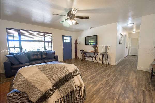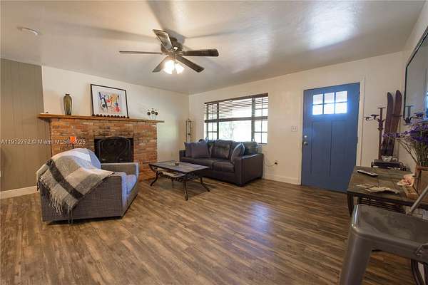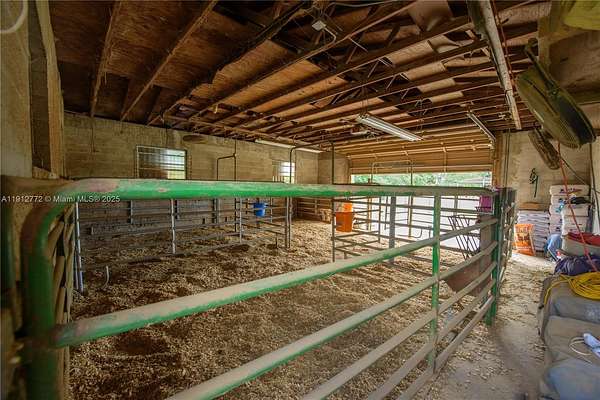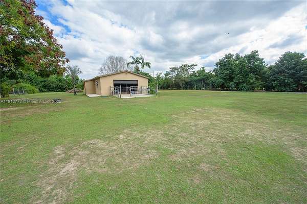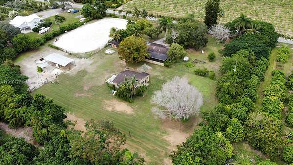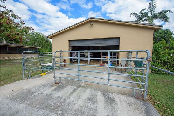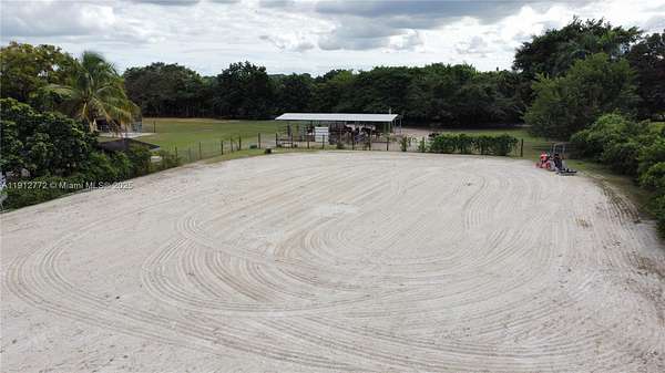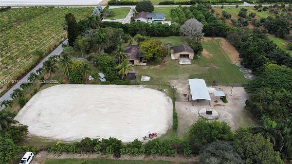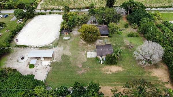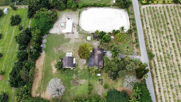 Gorgeous Homestead property! Features laminate & tile floors, fan/lights, blinds, and a cozy wood-burning fireplace in the living room. Elegant dining room with chandelier. Beautiful kitchen with dark wood cabinets, granite counters, stove, fridge & dishwasher. Master bedroom has sliding door, small walk-in closet & shower bath. Additional bedroom with wall-to-wall closet. Laundry room w/ W&D and window. Covered screened patio, carport, pump house with 2024 motor, water softener & storage. Full-size riding ring, metal 4-stall horse setup, detached garage with bathroom. Lush tropical fruit trees throughout--truly stunning! PROOF OF FUNDS AND/OR PRE-APPROVAL LETTER REQUIRED PRIOR TO SCHEDULING A SHOWING OF THE PROPERTY!